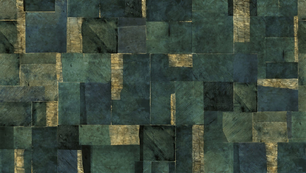 Bold green and gold tones in abstract wallpaper patterns.