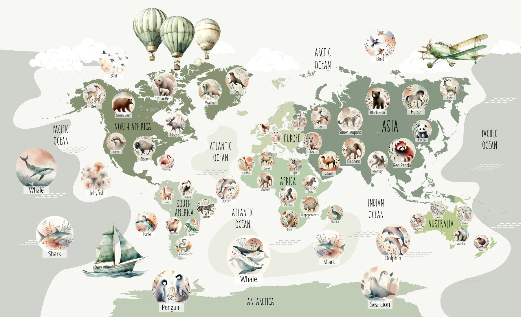 Embark on a global adventure with this charming wallpaper for walls. The design presents a muted world map graced with watercolor-style animal illustrations specific to each continent. Hot air balloons and a vintage airplane add to the whimsical appeal. Soft colors create a calming backdrop, perfect for a nursery or kid's room. It encourages learning and sparks curiosity, while effortlessly complementing serene or playful interior themes.