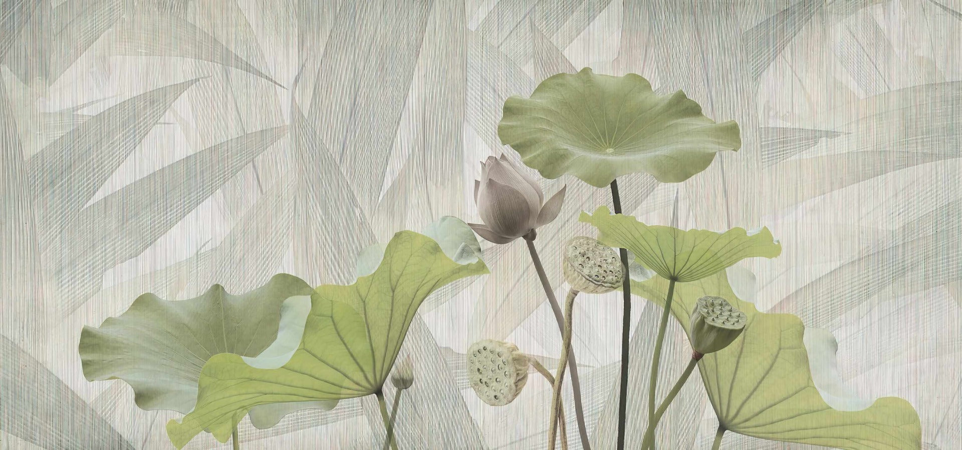 Nature-inspired mural wallpaper with soft green lotus accents.