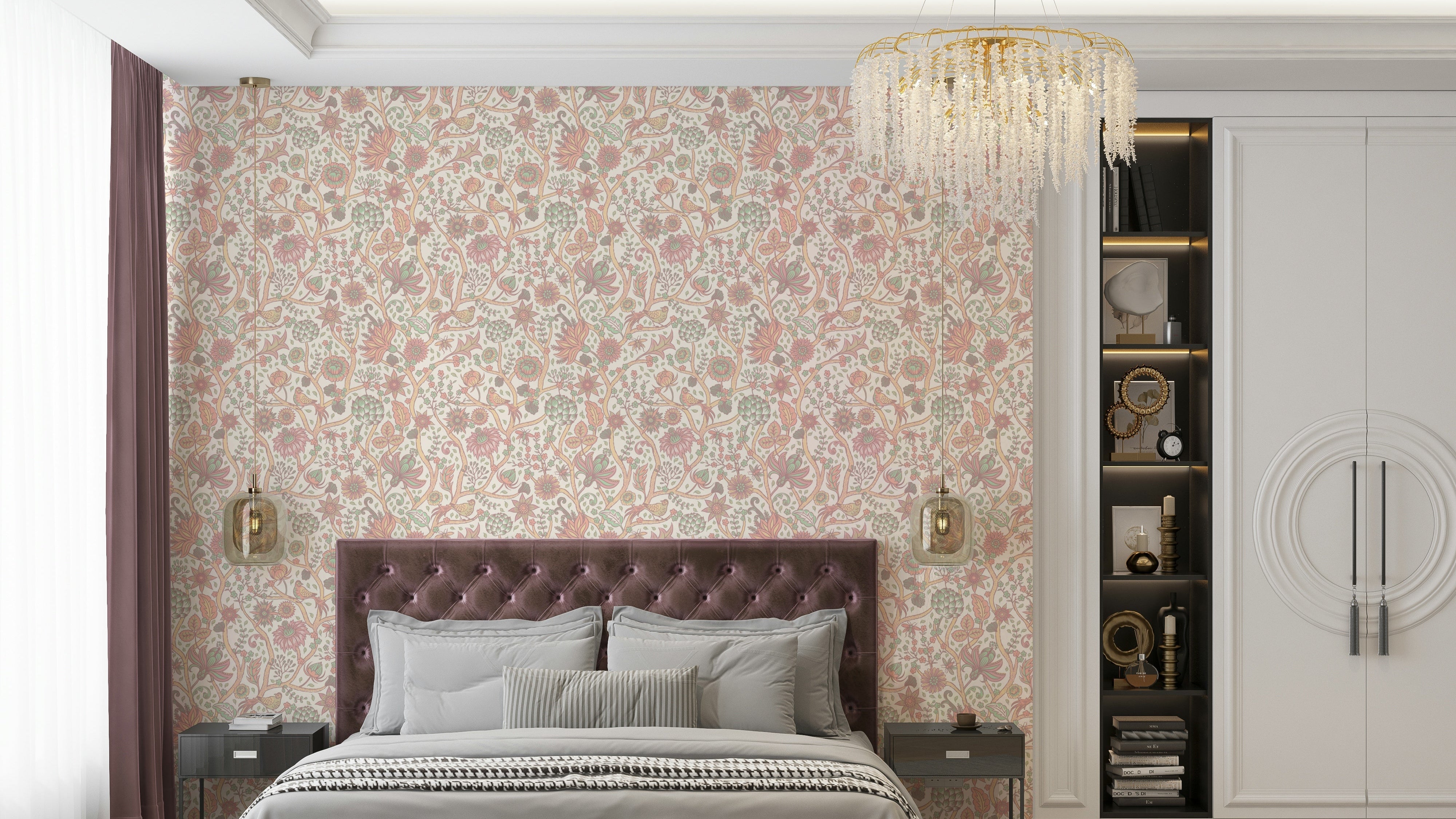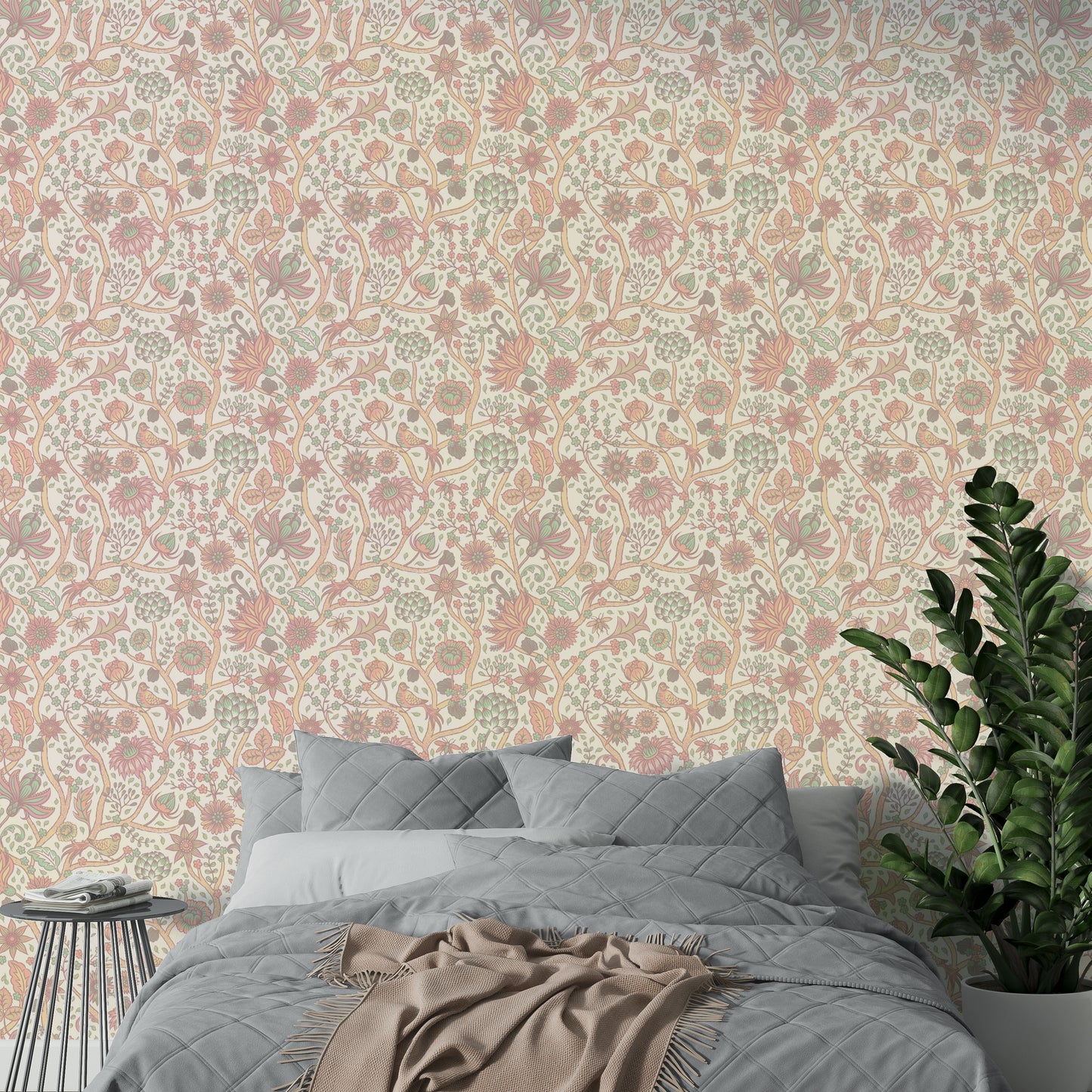 Embrace tranquility with "Green Tree of Life – Blush Meadow," a serene wallpaper featuring a whimsical, hand-drawn floral design. Delicate blush pink and mint green blossoms intertwine around elegant, gently curving branches, creating a sense of gentle growth and natural harmony. Small birds and insects add playful accents to this idyllic meadow scene. The soft, pastel palette evokes a feeling of calm and peaceful contemplation, making it the perfect addition to any space needing a touch of understated elegance and natural beauty. This wallpaper is a delightful blend of vintage charm and modern minimalist aesthetic, bringing a touch of springtime freshness to your digital world.