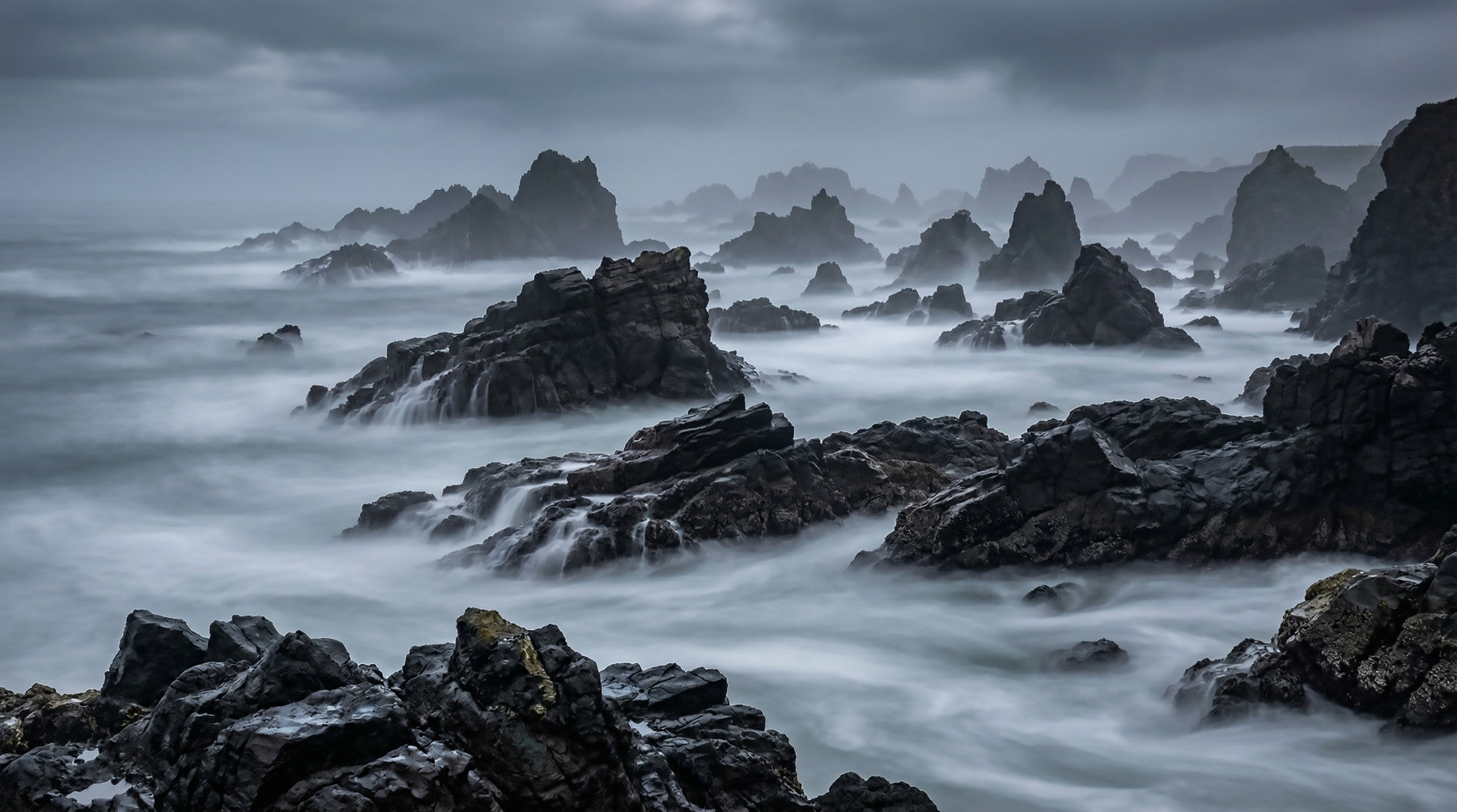 This striking wallpaper for walls captures the raw power and serene mystery of a rugged coastline. Jagged dark rock formations emerge from an ethereal, long-exposure sea, while a dramatic cloudy sky looms above. The design features a sophisticated color palette dominated by deep grays, charcoal, and muted blues, highlighted by soft, misty whites. This atmospheric landscape photography creates a tranquil yet powerful focal point in any room. It transforms living rooms, bedrooms, or studies, infusing spaces with a contemplative and profound ambiance. Install this design to expand the visual depth of a hallway or to create a serene backdrop in a modern dining room. Its dramatic beauty enhances contemporary and minimalist interiors.