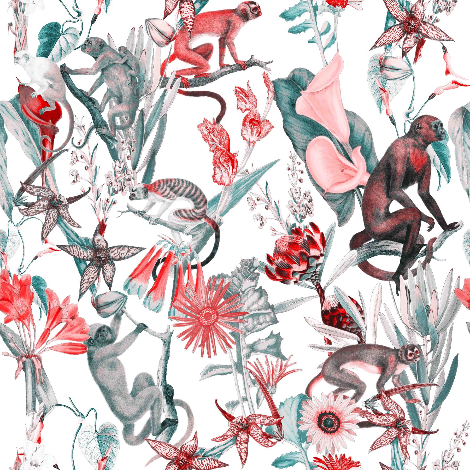 Embrace the carefree spirit of 'Hakuna' with this vibrant wallpaper. Lush flora in hues of muted teal and radiant red provide a backdrop for playful monkeys swinging and lounging amidst the foliage. The design evokes a sense of tranquility and whimsy, a reminder to let go of worries and appreciate the simple joys of life. The detailed botanical illustrations combined with the charming primate figures create a captivating visual experience, perfect for adding a touch of exotic serenity to any space. Let this wallpaper transport you to a world where 'Hakuna Matata' reigns supreme.