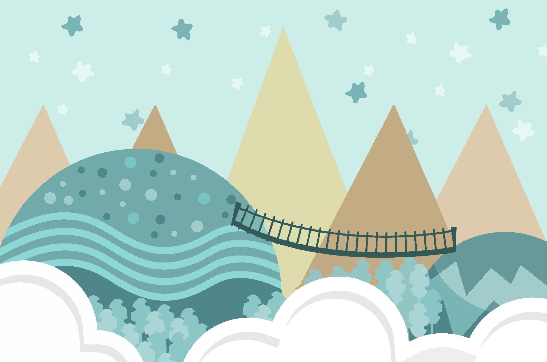 Brighten your child's room with our enchanting Kids Animated Pastel Mountain Wallpaper! Immerse their space in a fairytale fantasy, complete with cartoon mountains, whimsical bridges, twinkling stars, and friendly trees. Each vibrant motif bursts with color, bringing energy and a playful spirit to any nursery or bedroom.