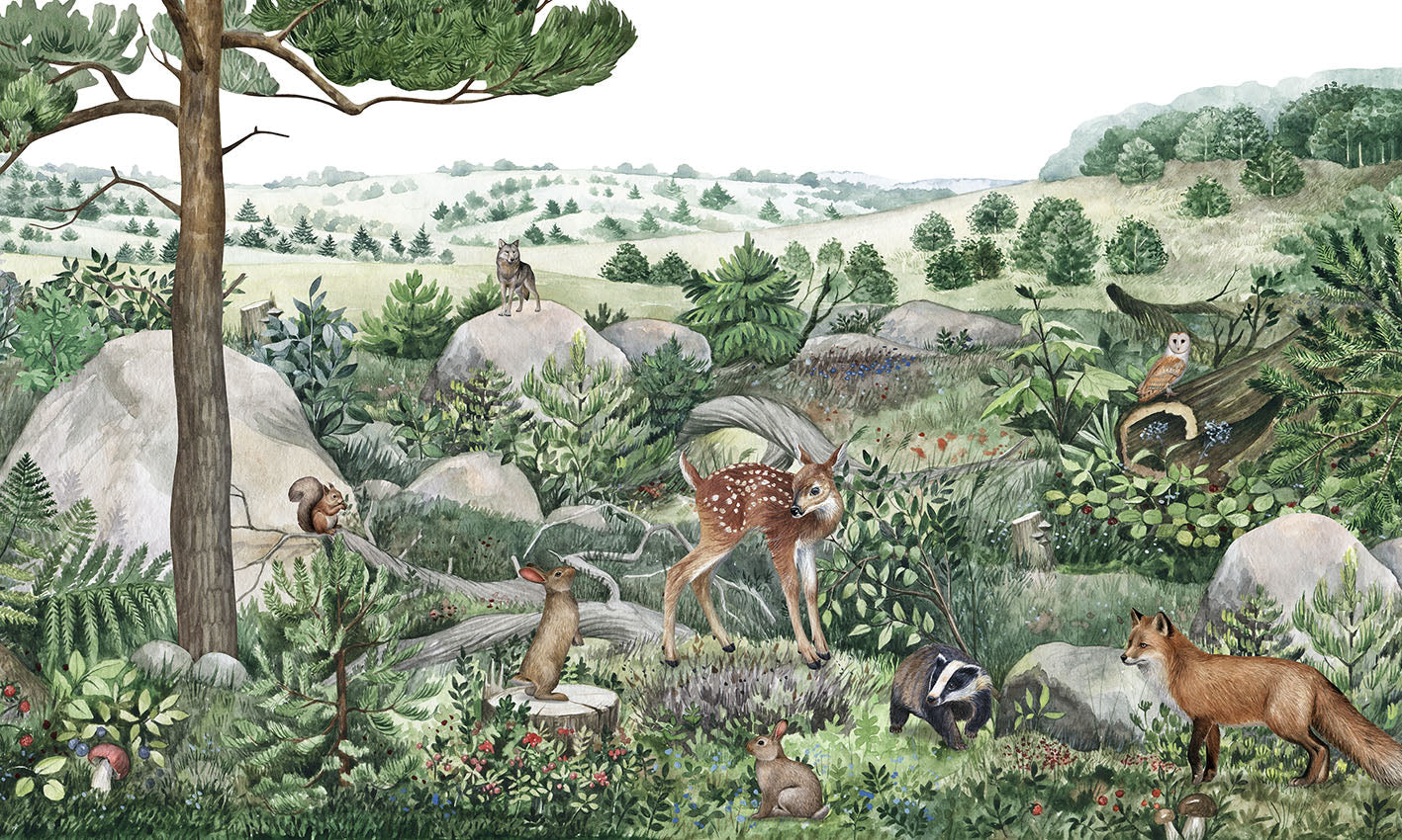 Nature-inspired Happy Hills wallpaper featuring woodland creatures.