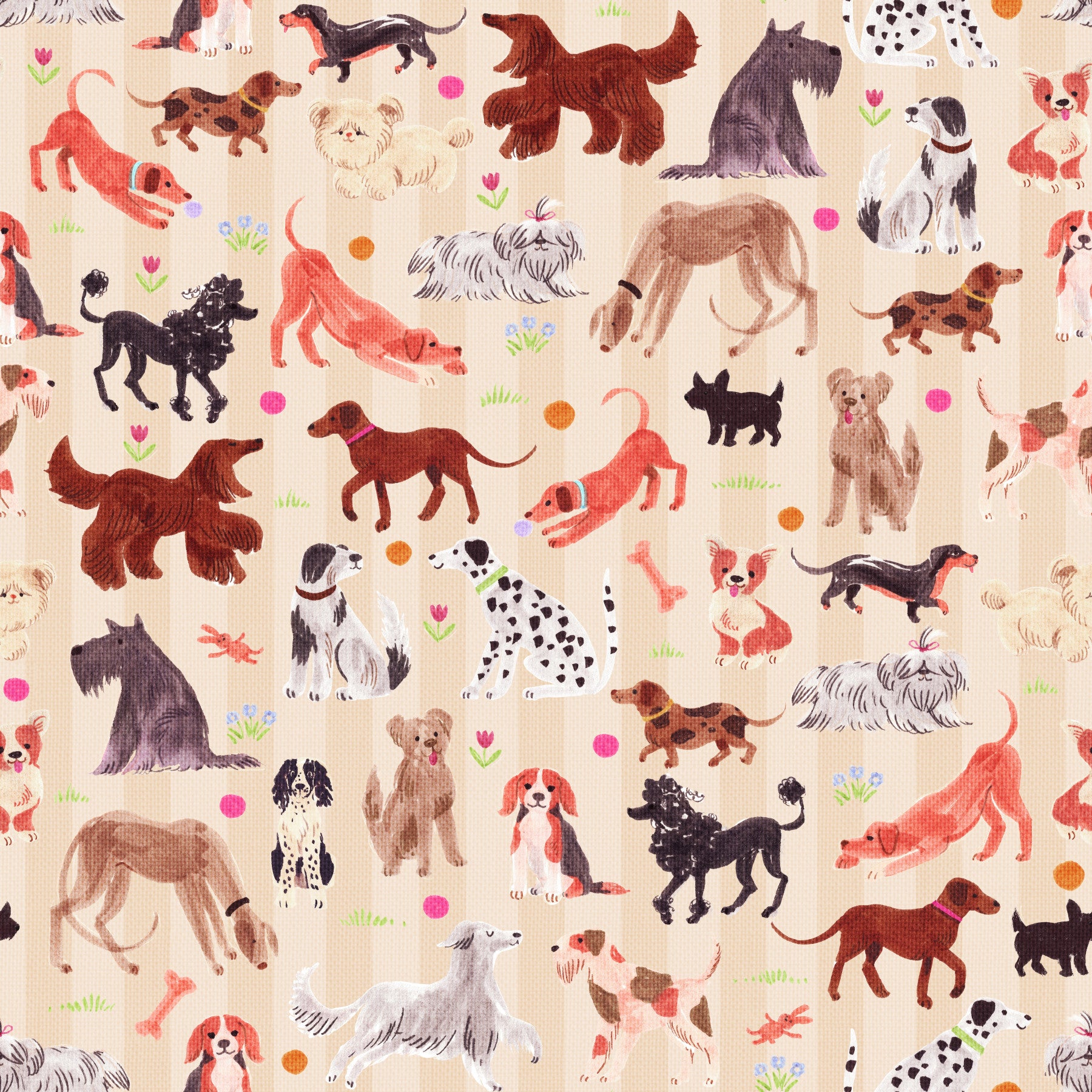 A delightful wallpaper featuring a charming collection of hand-drawn dogs. Each pup, rendered in a whimsical watercolor style against a soft beige and striped background, exudes happiness and playful energy. From playful Dachshunds to elegant Afghan Hounds, a diverse array of breeds frolic amidst scattered flowers and playful bones, creating a cheerful and vibrant scene perfect for dog lovers.