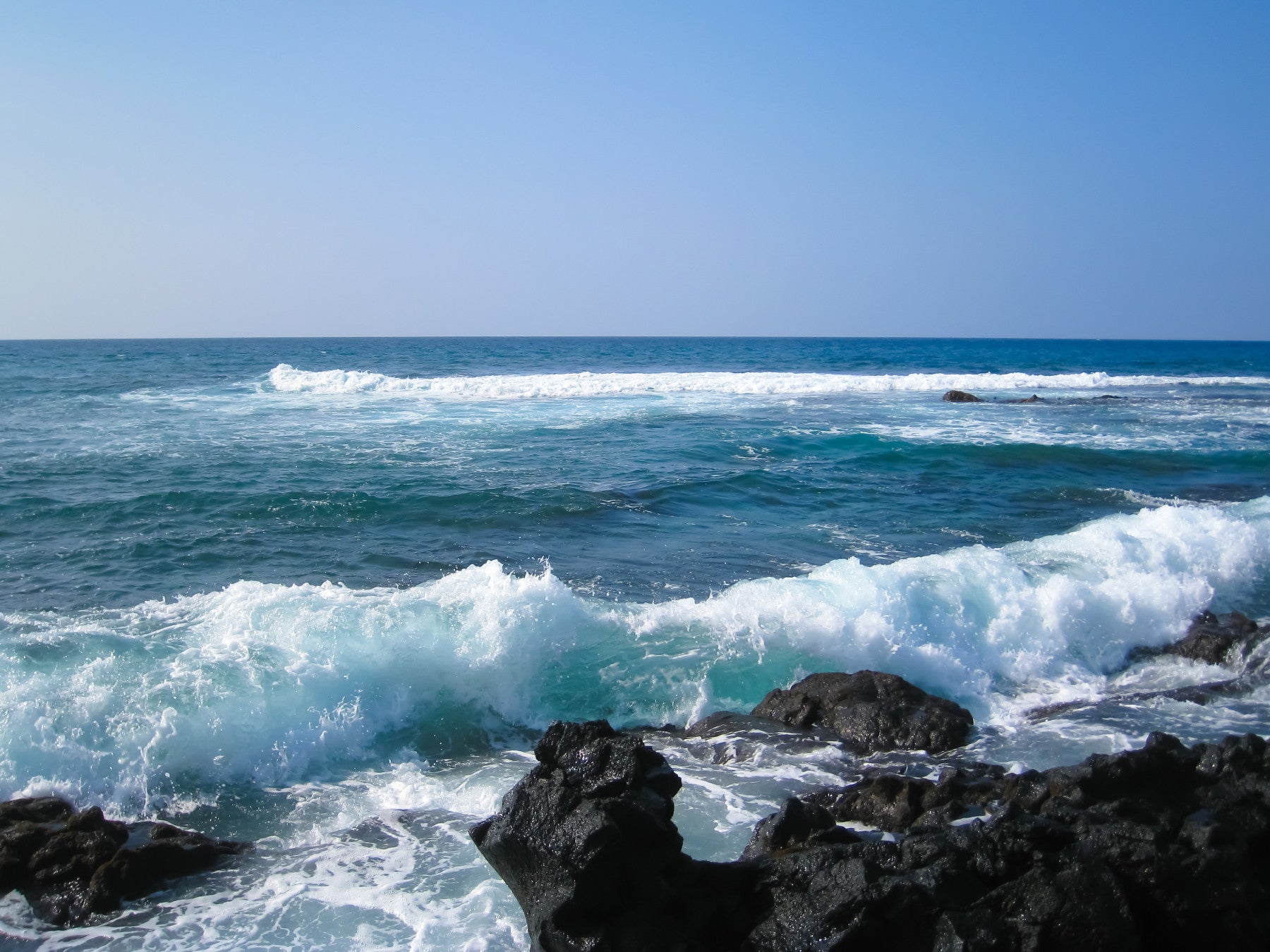 Experience the raw beauty of the Hawaiian coastline with this captivating wallpaper. Turquoise waves crash against the dark, volcanic rocks of the shore, creating a dynamic interplay of color and texture. The clear, azure sky hints at the tropical warmth and invites a sense of tranquility. White foam dances across the water's surface, providing a stunning contrast to the rugged, unyielding rocks. This image captures the untamed spirit of Hawaii, offering a glimpse into the powerful forces shaping its unique landscape. Perfect for bringing a touch of the islands' natural splendor to your screen.