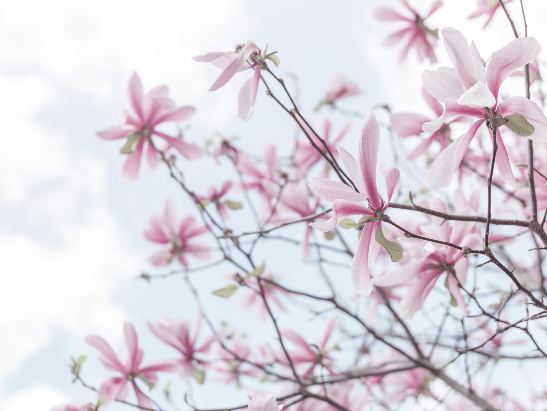 Wall mural of magnolias with soft hues for a calm home vibe.
