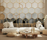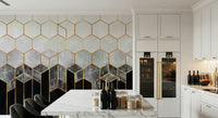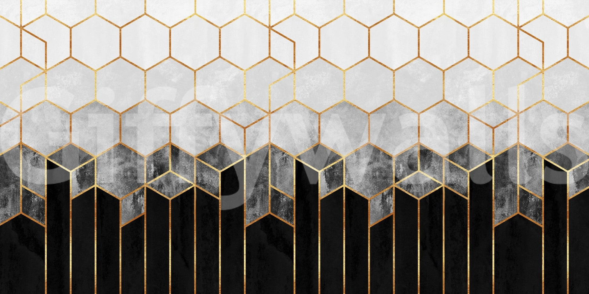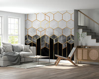 Transform any room with this captivating geometric wallpaper for walls. The design features a striking arrangement of hexagons with gold trim, transitioning from white and gray to deep black, creating a dramatic ombre effect. This design offers a sleek, artistic touch, ideal for spaces that need a dash of elegance. It works well in modern living rooms, sophisticated bedrooms, or even stylish hallways, blending effortlessly with various décor schemes.