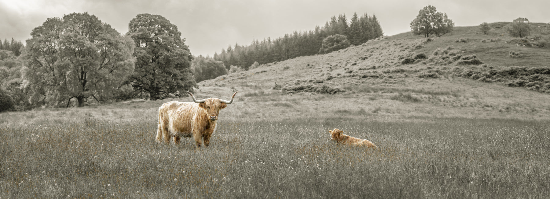 Bring the serene Scottish Highlands into your home with this nature-inspired wallpaper. The photograph features a majestic Highland cow and its calf amidst a grassy field, with rolling hills in the distance. Muted tones enhance the sense of calm. This stunning wallpaper for walls creates a tranquil atmosphere, making it ideal for living rooms, bedrooms, or even a home office. Invite the charm of the countryside into your interior design and transform any room into a peaceful retreat.
