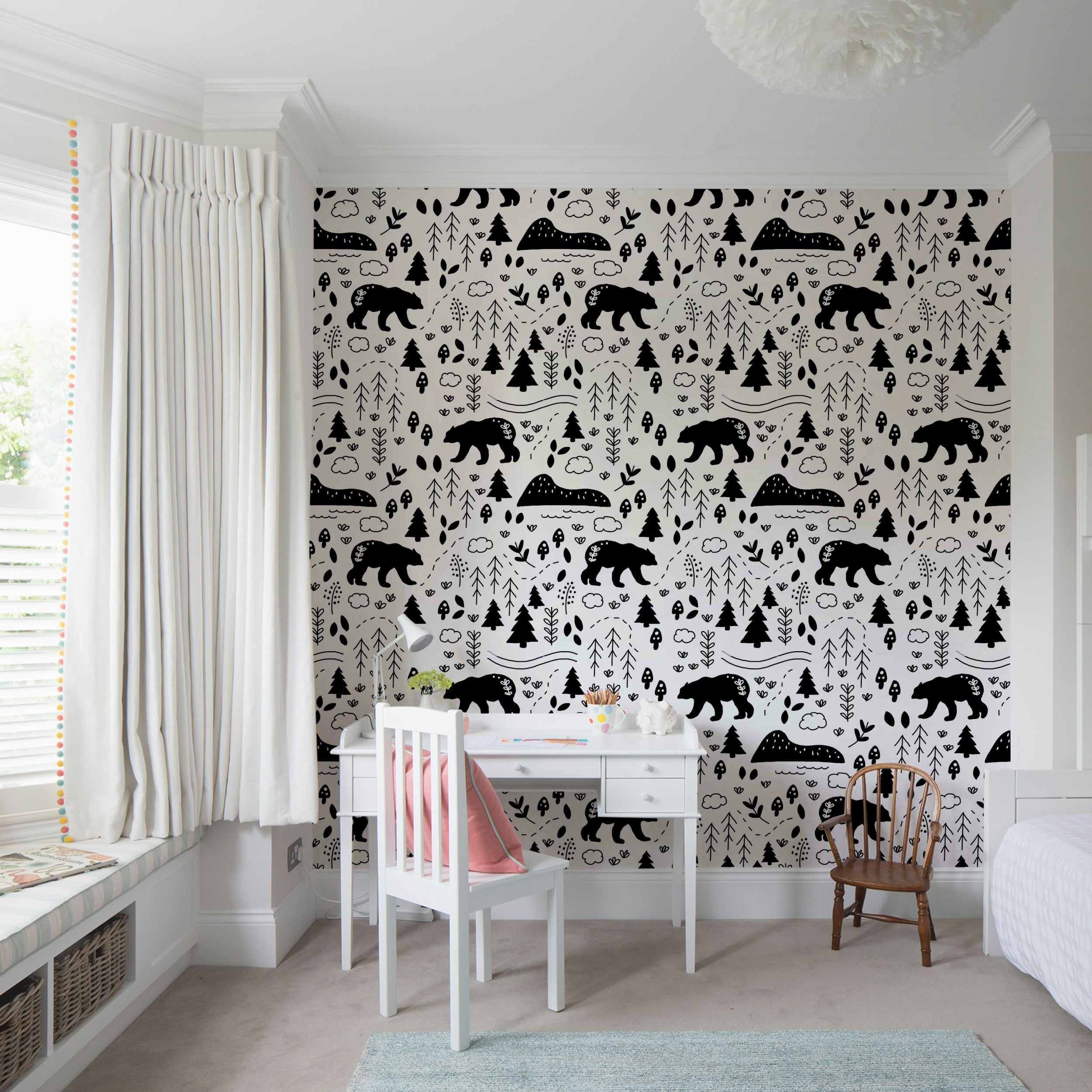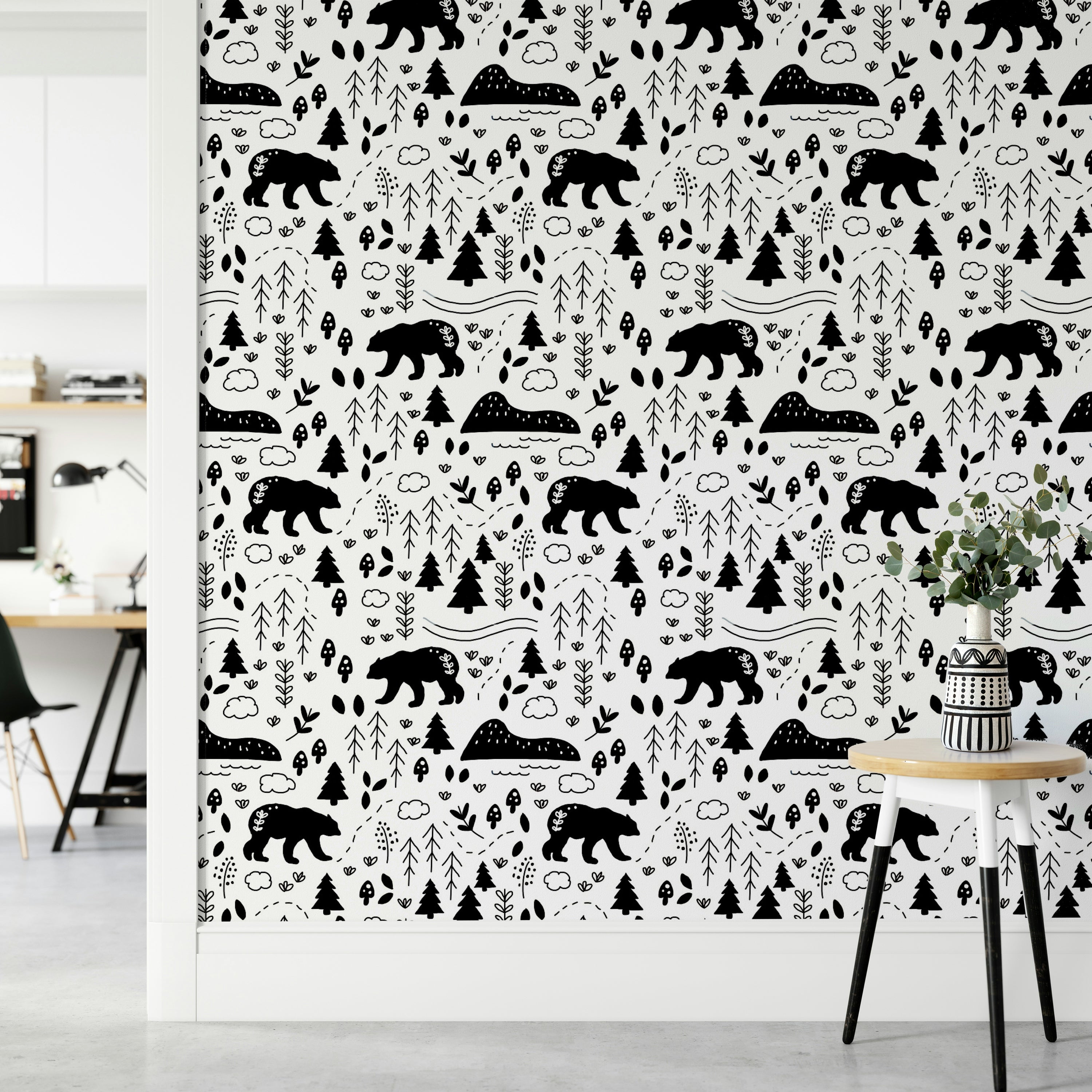 Embrace the serene beauty of 'Hiking Country' with this captivating wallpaper. Silhouetted bears traverse a whimsical landscape of stylized evergreens, whimsical flora, and charming mushrooms, all rendered in a striking monochrome palette. The minimalist design evokes a sense of peaceful adventure, perfect for those who appreciate the simple joys of nature and a touch of Scandinavian aesthetic. The repeating pattern creates a calming and cohesive backdrop for your digital devices, bringing a breath of fresh air to your screen.