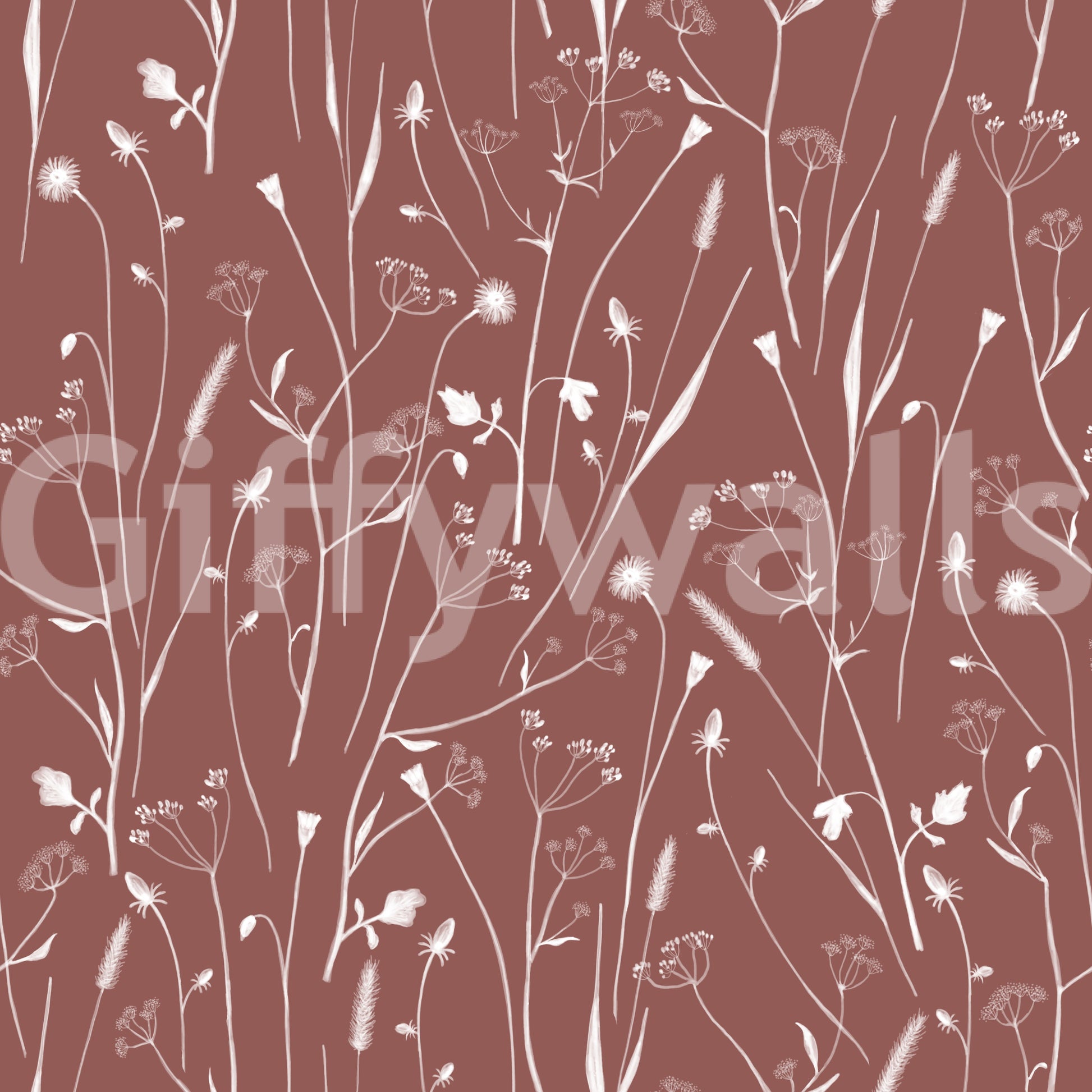 Embrace the comforting embrace of nature with 'Homeland Floral Terracotta'. This design evokes a sense of rustic charm and understated elegance, transforming any room into a warm and inviting sanctuary. Delicate, hand-drawn floral silhouettes in soft white dance across a rich terracotta backdrop, reminiscent of sun-baked earth and blooming meadows. The intricate details of wildflowers, grasses, and seed heads create a captivating visual texture, adding depth and dimension to your walls. Perfect for creating a serene bedroom retreat or a cozy living space, this wall décor brings the beauty of the countryside indoors, fostering a feeling of peace, tranquility, and connection to the natural world. This versatile design pairs effortlessly with natural materials and earthy tones, making it an ideal choice for both contemporary and traditional interiors.