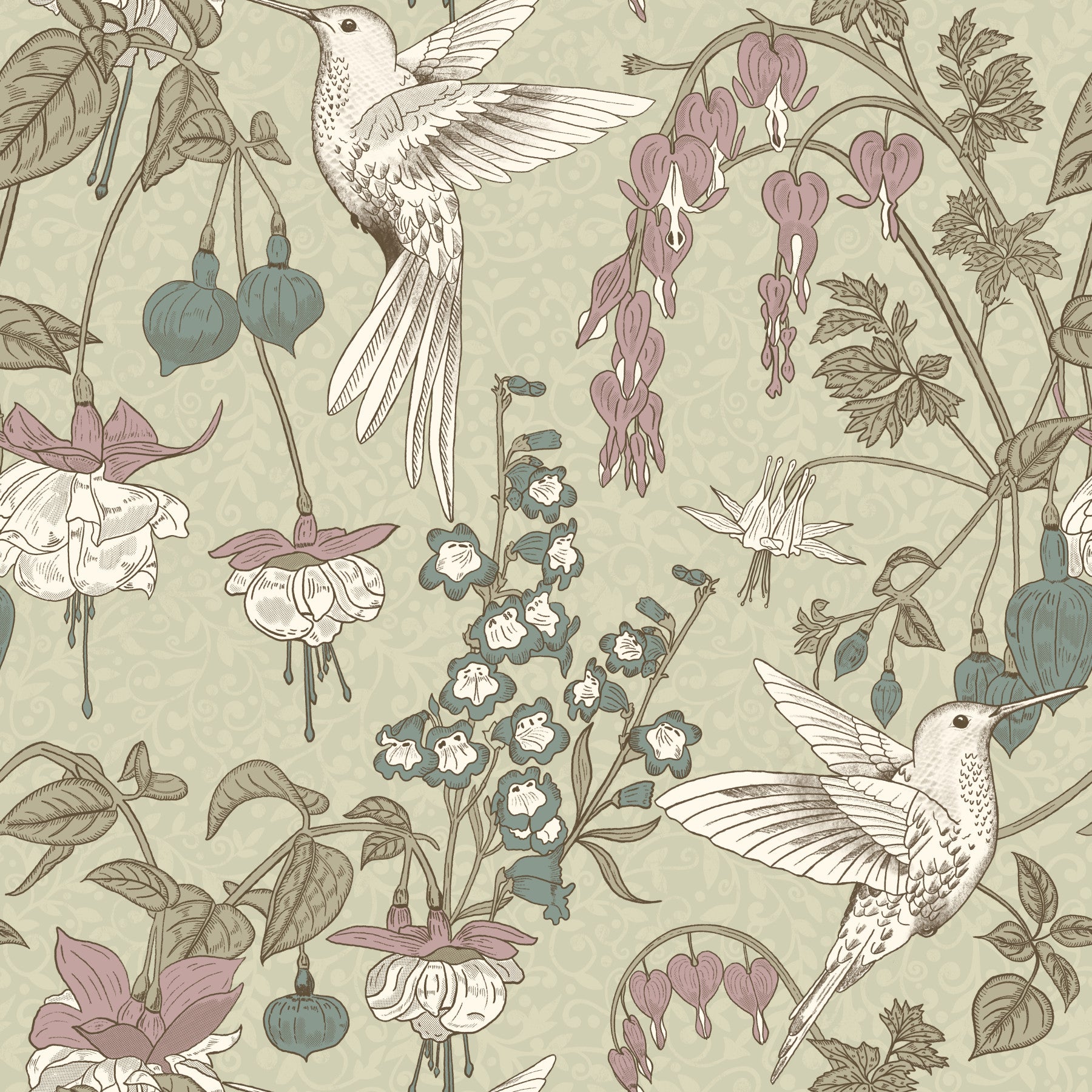 Bring nature inside with this detailed floral wallpaper. Observe hummingbirds dance among blossoms and heart-shaped blooms in a repeating pattern. The soft sage green background and muted colors create a tranquil mood. Perfect wallpaper for walls in bedrooms, living rooms, or dining rooms. This stylish print complements traditional and cottage-style interiors, adding a touch of botanical charm.