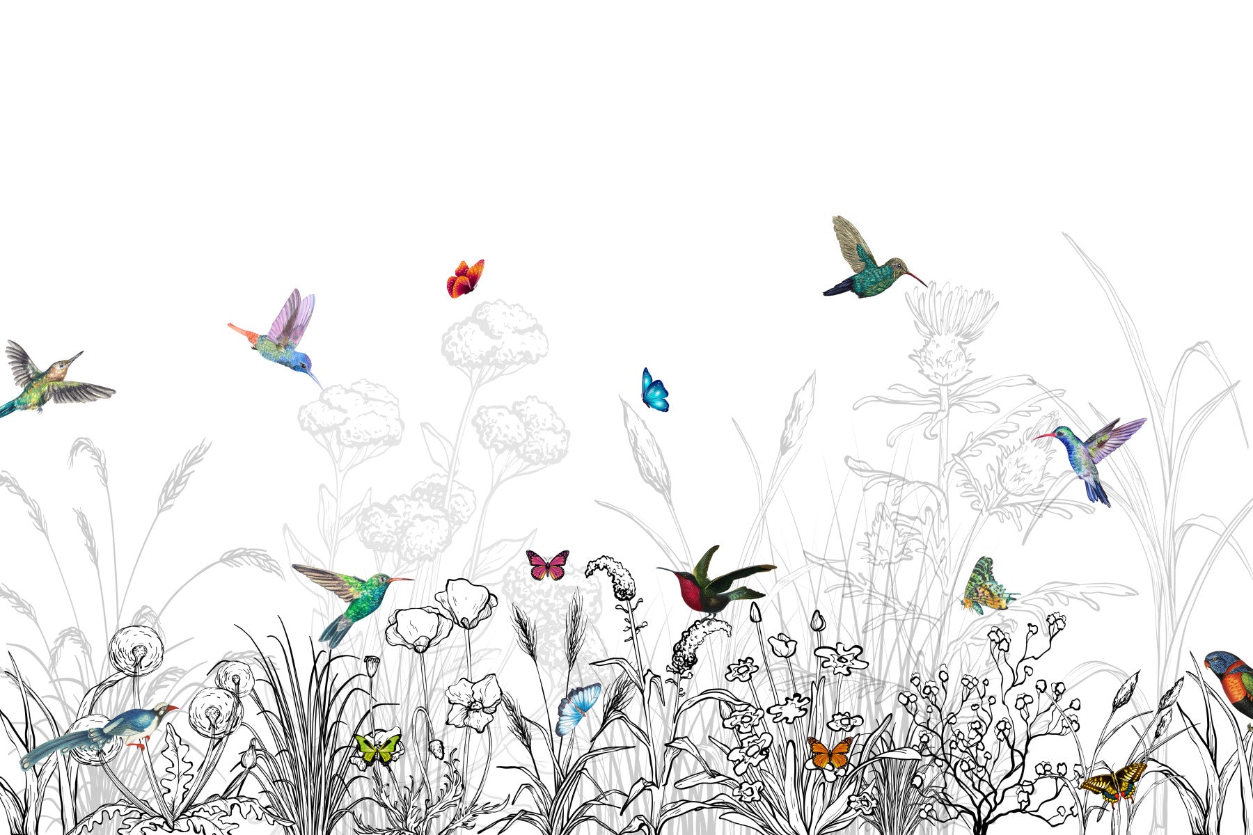 Transform your space with this whimsical wallpaper. Observe hummingbirds and butterflies flutter among monochrome meadows. Delicate details offer a blend of nature-inspired artistry and modern design. Ideal for creating a serene atmosphere in bedrooms, living rooms, or nurseries, this wallpaper for walls works wonders. The light and airy palette easily complements minimalist or bohemian interiors, bringing a touch of the outdoors inside.
