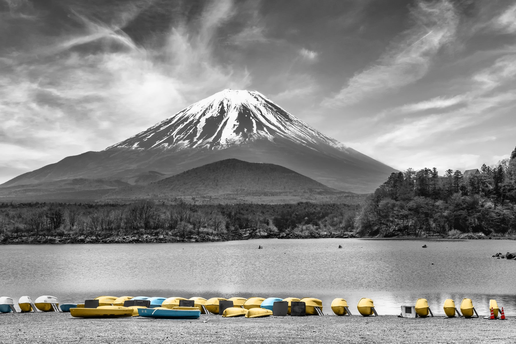 A peaceful idyll spreads out on the shores of picturesque Lake Shoji, while the majestic Fuji-san is reflected in the calm waters. Along the shore, boats rest quietly in the clear water, ready to take visitors on a silent cruise across the lake. This enchanting black and white image with highlighted vibrant colors, nestled in the pristine nature and sublime splendor of Mount Fuji, invites you to enjoy the moment of quiet beauty and unwind.