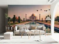 Transform your space with the majestic allure of India's Taj Mahal. This architectural marvel is presented through its reflecting water, framed by lush greenery and birds gliding overhead. This wallpaper for walls brings the splendor of this historical site into your home. The serene ambiance makes it great for a meditation space, reading room, or any area where you want to promote calmness. Its versatile design easily blends with both modern and traditional décor.