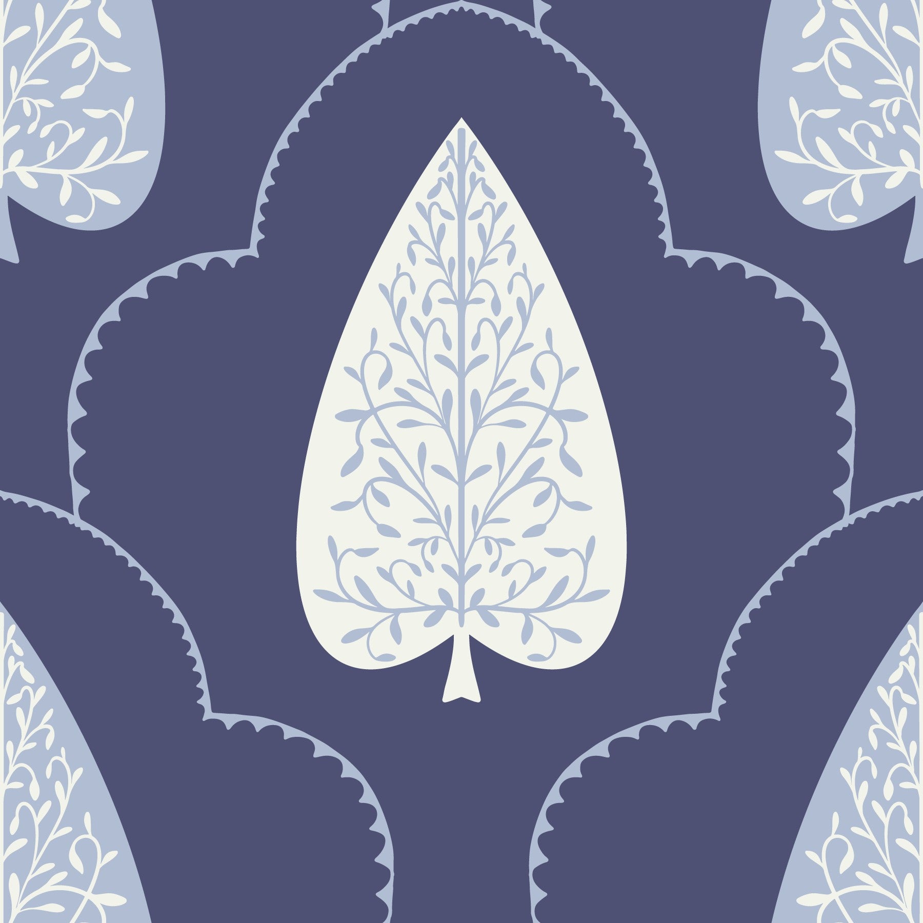 Indigo Grove wallpaper featuring elegant botanical spade pattern on deep blue.
