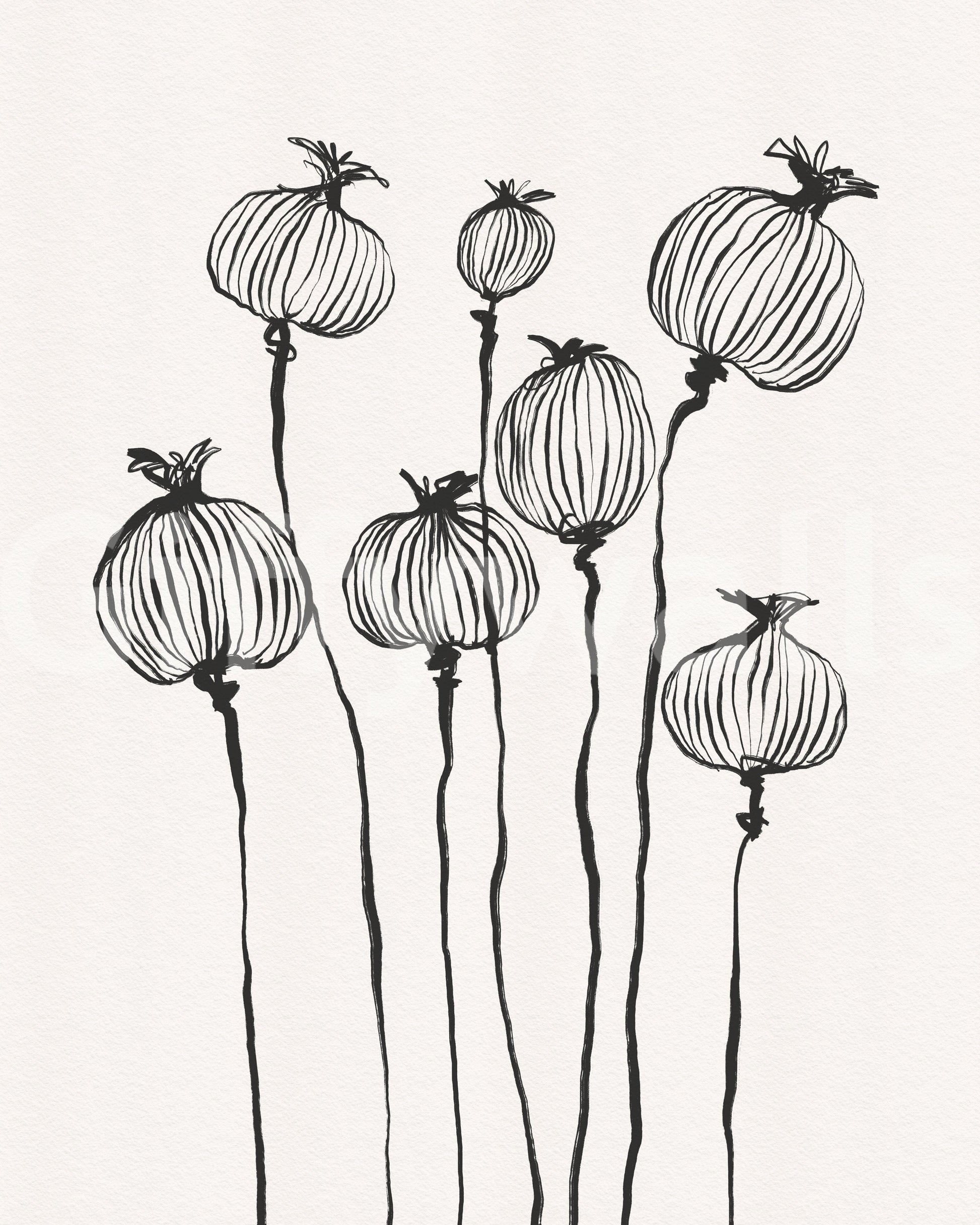Embrace the understated elegance of 'Ink Poppy Pods,' a striking wall décor accent that transforms any room into a haven of minimalist beauty. This design showcases delicate poppy seed pods rendered in expressive ink strokes, capturing their essence with a graceful simplicity. The slender stems rise with a fluid motion, supporting the meticulously detailed pods, each line contributing to a compelling visual texture. The monochrome palette lends a timeless sophistication, making it a versatile addition to various interior styles, from modern to bohemian. 'Ink Poppy Pods' invites tranquility and a subtle touch of nature into your home, making it a perfect statement piece for those who appreciate the beauty in simplicity and the power of artistic expression. Elevate your space with this evocative design that speaks volumes with its refined aesthetic.