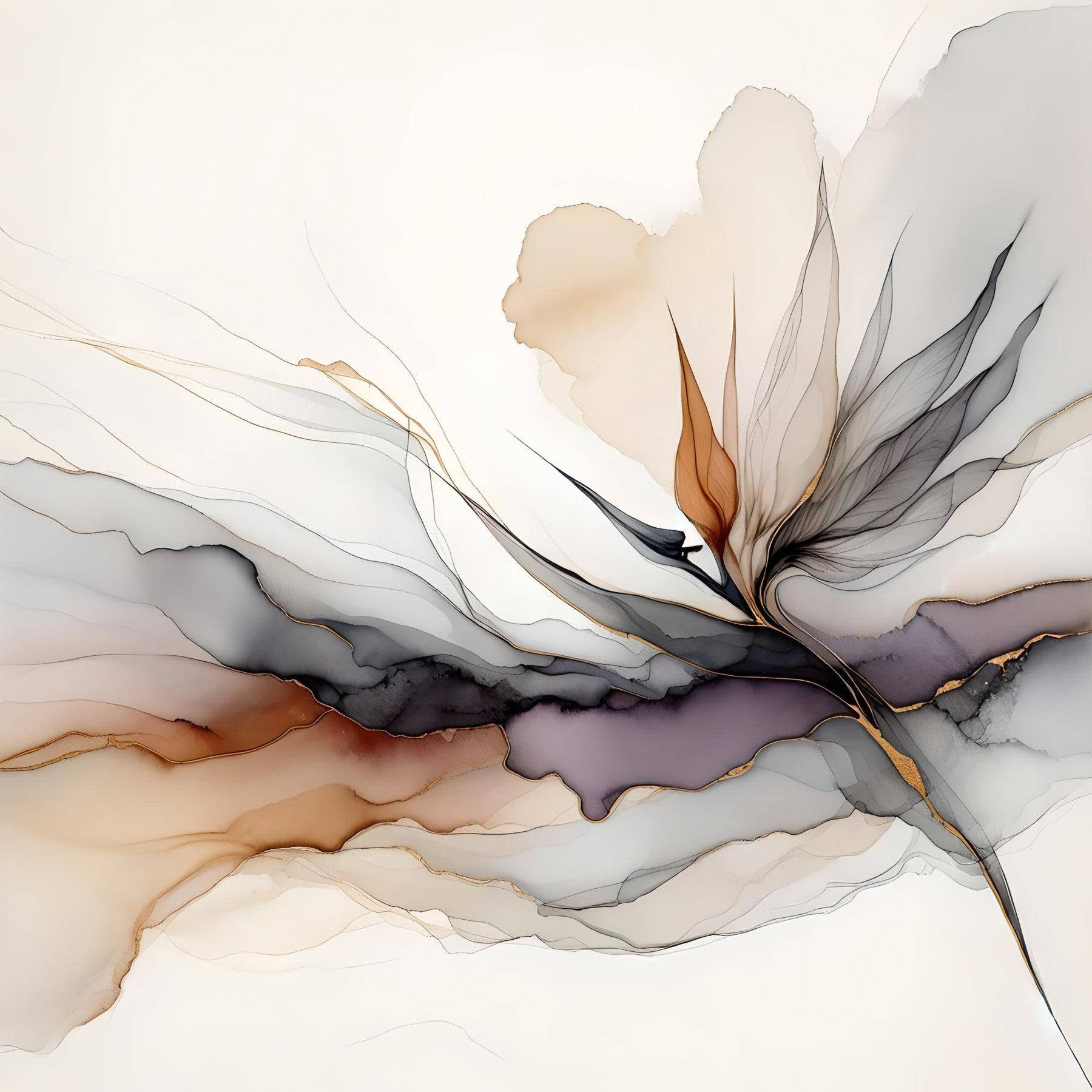 This stunning wallpaper showcases a captivating abstract floral design rendered in alcohol ink. The flowing lines and soft color palette of blush pinks, subtle grays, and warm browns create a serene and calming atmosphere. Delicate gold accents add a touch of luxury, enhancing the ethereal beauty of the artwork. The organic shapes and fluid forms evoke a sense of tranquility and sophistication, making it perfect for modern living spaces, bedrooms, or meditation rooms. The image invites viewers to lose themselves in its peaceful fluidity and elegant simplicity.