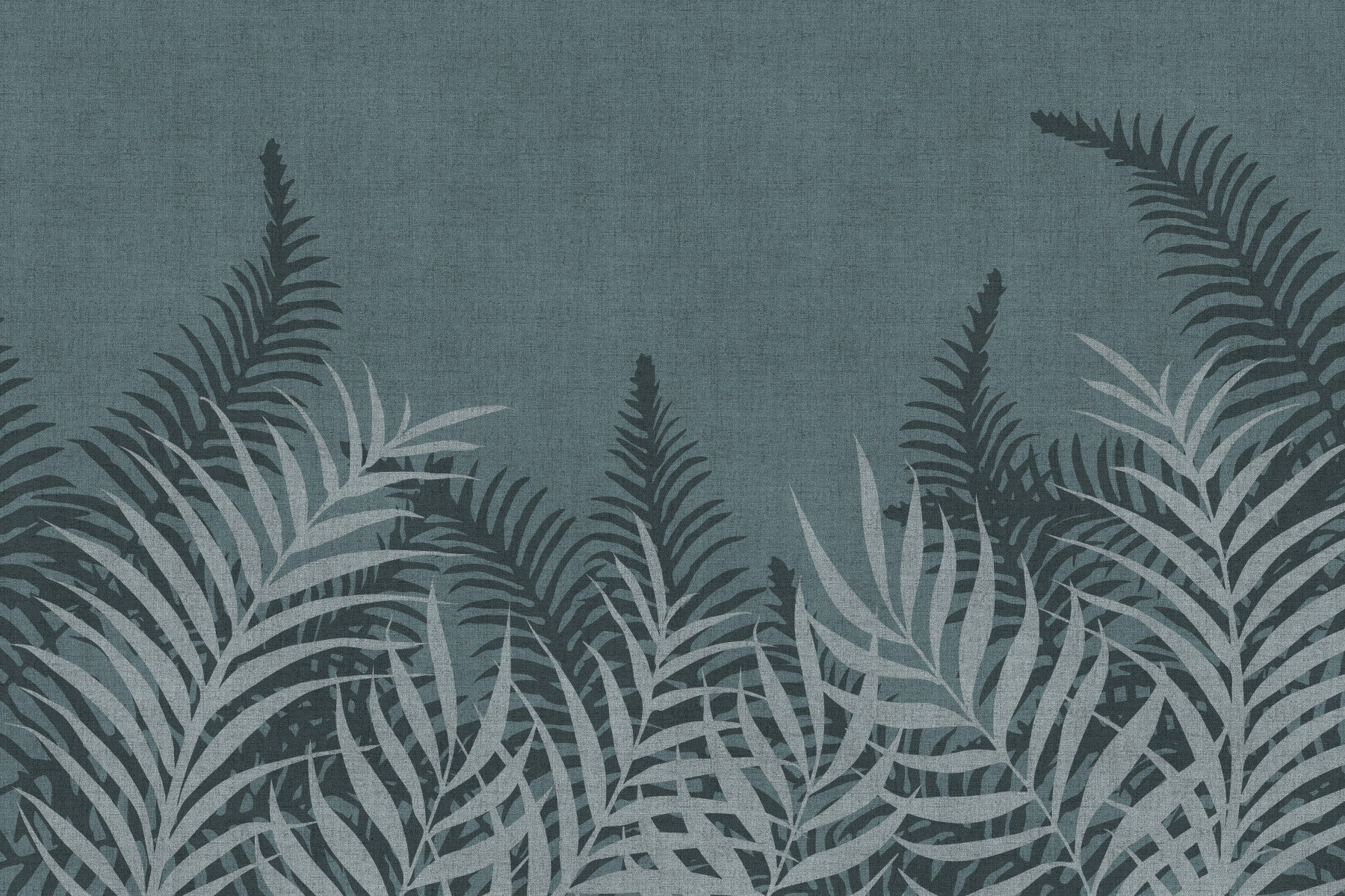 Moody Jungle Fog wall mural with silvery blue botanical fronds.