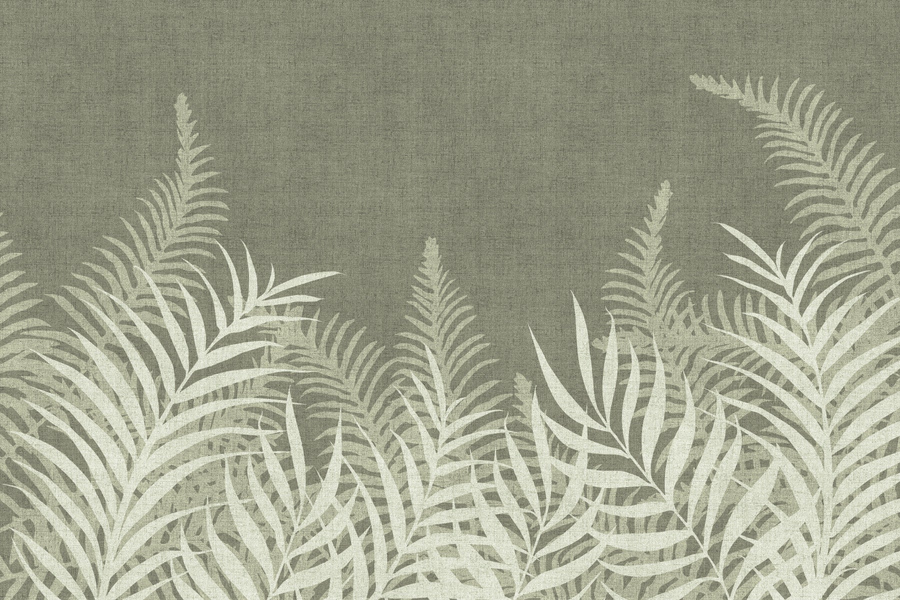 Misty Jungle Sage wall mural with pale botanical fronds and shadows.
