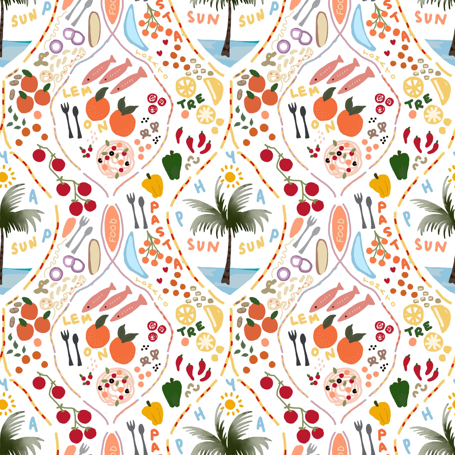 Transform your interiors with this unique wallpaper for walls. Enjoy the bright color palette combining oranges and pinks together with summer fruits. The whimsical arrangement makes this wallpaper a charming choice for kitchens, breakfast nooks, or sunrooms, adding a delightful touch to meal times and casual gatherings. The pattern generates a summer sensation for an airy sensation of endless vacation. Elevate the room with this beautiful design.