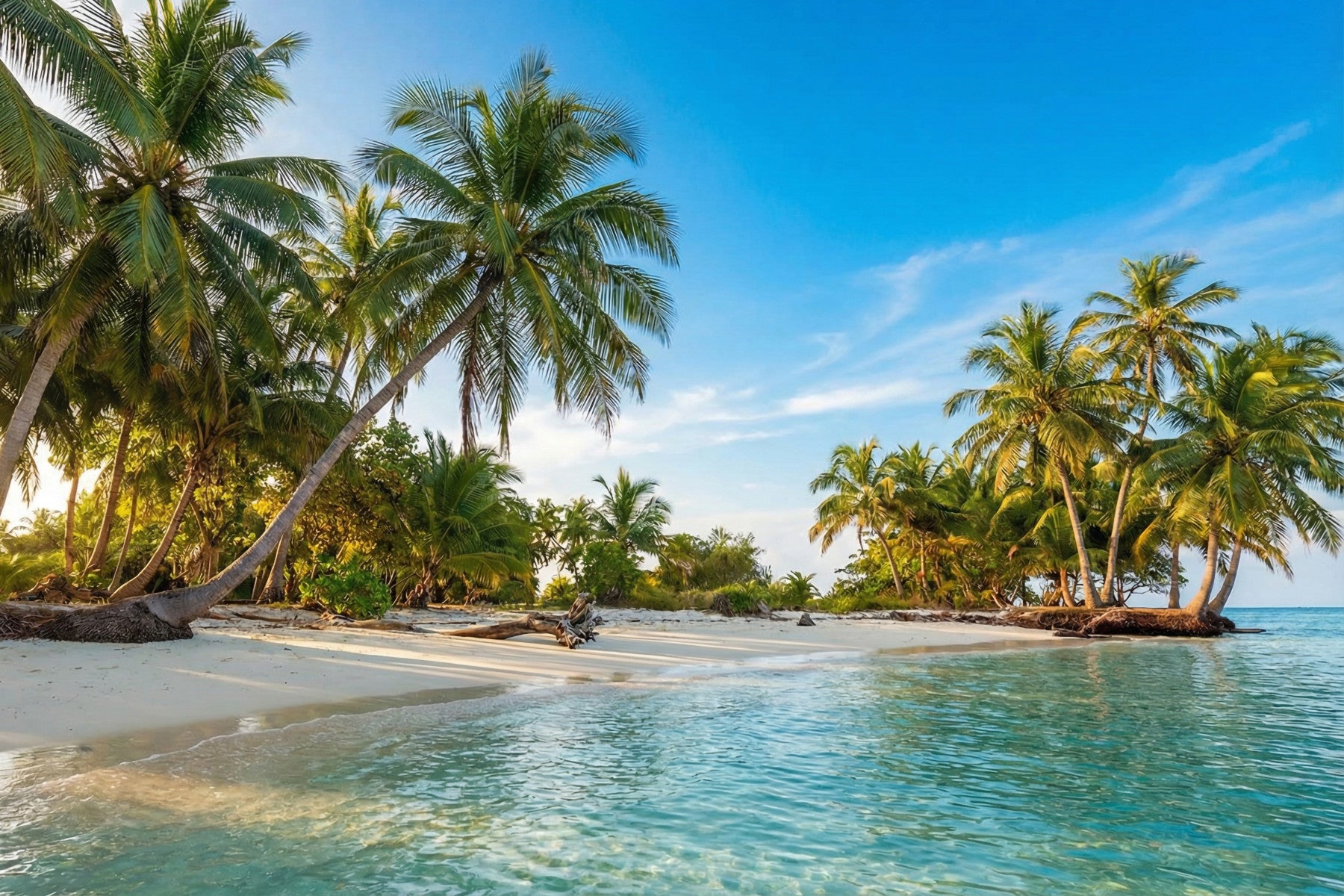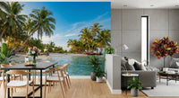 Escape to an idyllic island with this breathtaking wallpaper for walls. The design showcases lush palm trees lining a white sandy beach, kissed by gentle turquoise waters. The clear blue sky offers a sense of spaciousness and calm. This wallpaper evokes relaxation and tranquility, making it perfect for bedrooms, bathrooms, or any space where you want to create a peaceful retreat. The vibrant colors and detailed imagery will enrich your walls, offering a scenic view that transforms any room into a personal sanctuary.