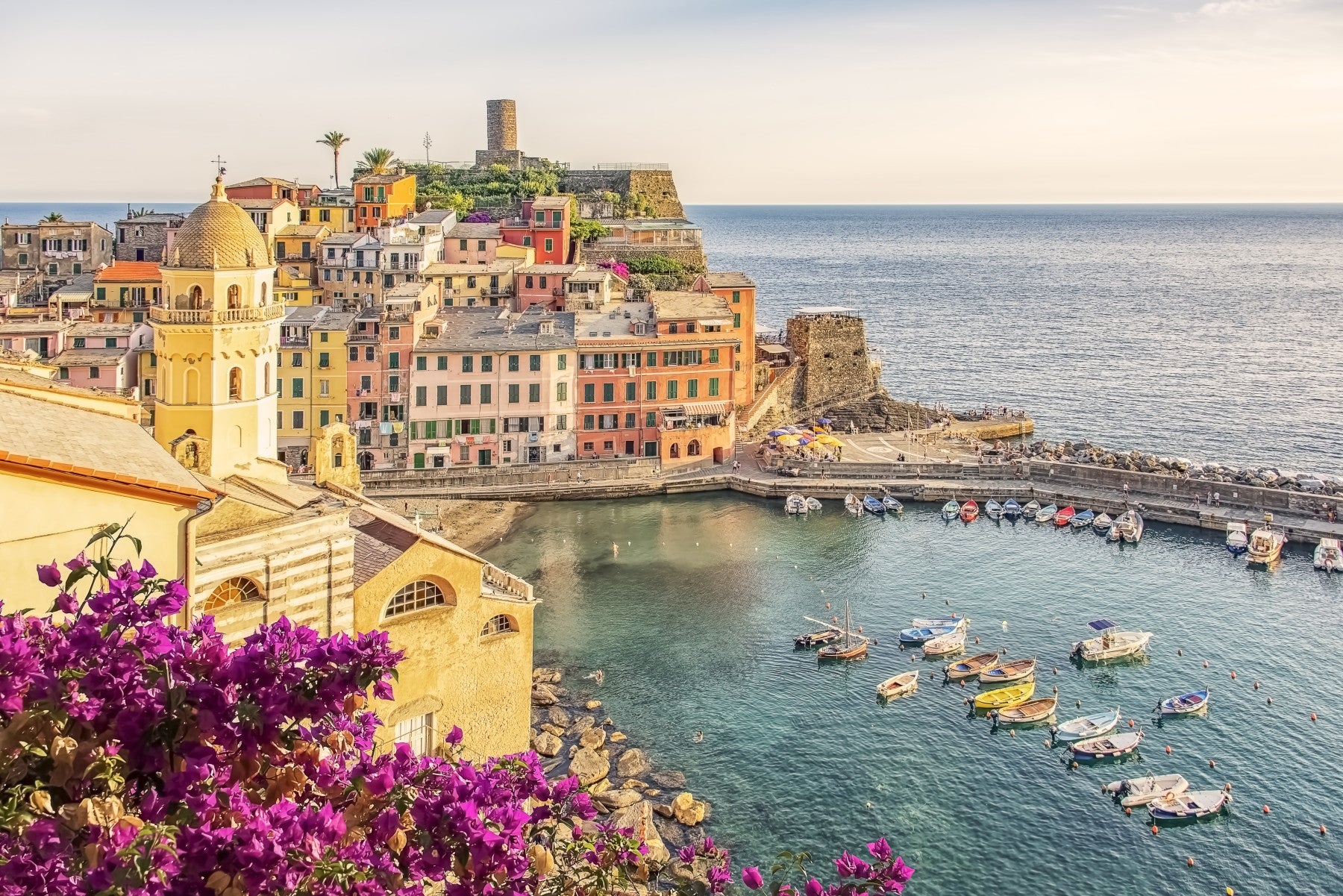 Escape to the sunny shores of Italy with this picturesque wallpaper. The colorful buildings cascade down to a tranquil harbor filled with charming boats. The vibrant pink bougainvillea adds a touch of romance to the scene. The gentle sea and soft sunlight create a calming ambiance, perfect for a bedroom or study. Use this wallpaper for walls to transform a space into a peaceful retreat. The design complements interiors with its warm palette and detailed architecture, transporting you to the Italian Riviera.