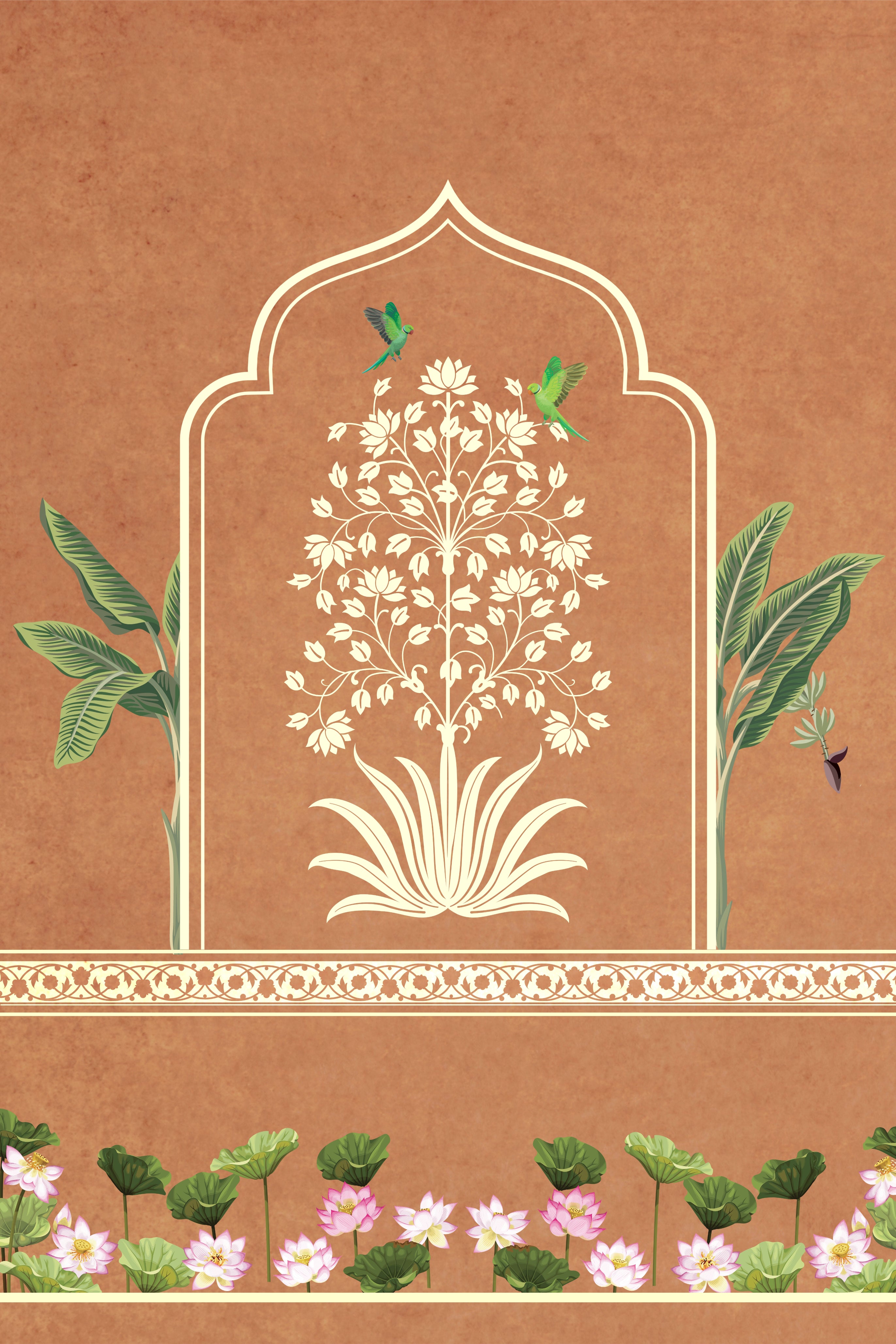 Invite the timeless beauty of Indian artistry into your space with the Jharokha Madhuban Bloom Wall Mural. This brilliant design is all about a careful and symmetrical "Tree of Life" motif that is bursting with lotuses and leaves. The central panel is bordered by vibrant and green botanical foliage that gives the whole impression both classic and grounded. The mural looks gorgeous against the warm, earthy terracotta. It is a sophisticated focal point for the living room, dining area, or bedroom. It is an elegant means to bring intricate patterns and calm, natural elements to your walls.