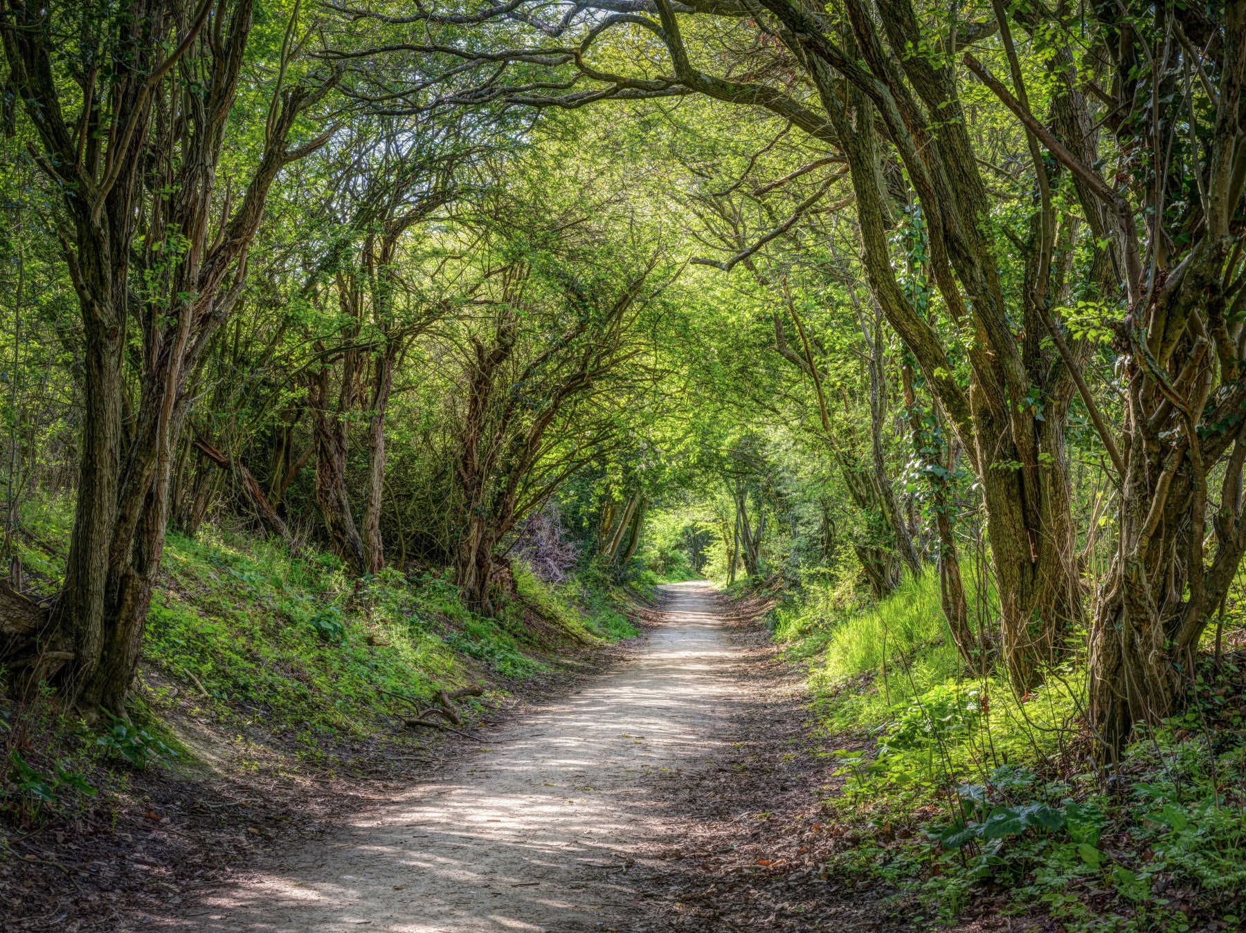 Road through dense forest. Transform your space with the serene beauty of a woodland canopy. Sunlight filters through dense trees creating a dreamy, calming effect. Ideal wallpaper for walls to bring nature indoors. The design will complement various interiors from rustic to modern. Use it to create a restful atmosphere in a bedroom, living room, or home office. The natural green color offers a peaceful ambiance and connects your space with the tranquility of a forest escape.