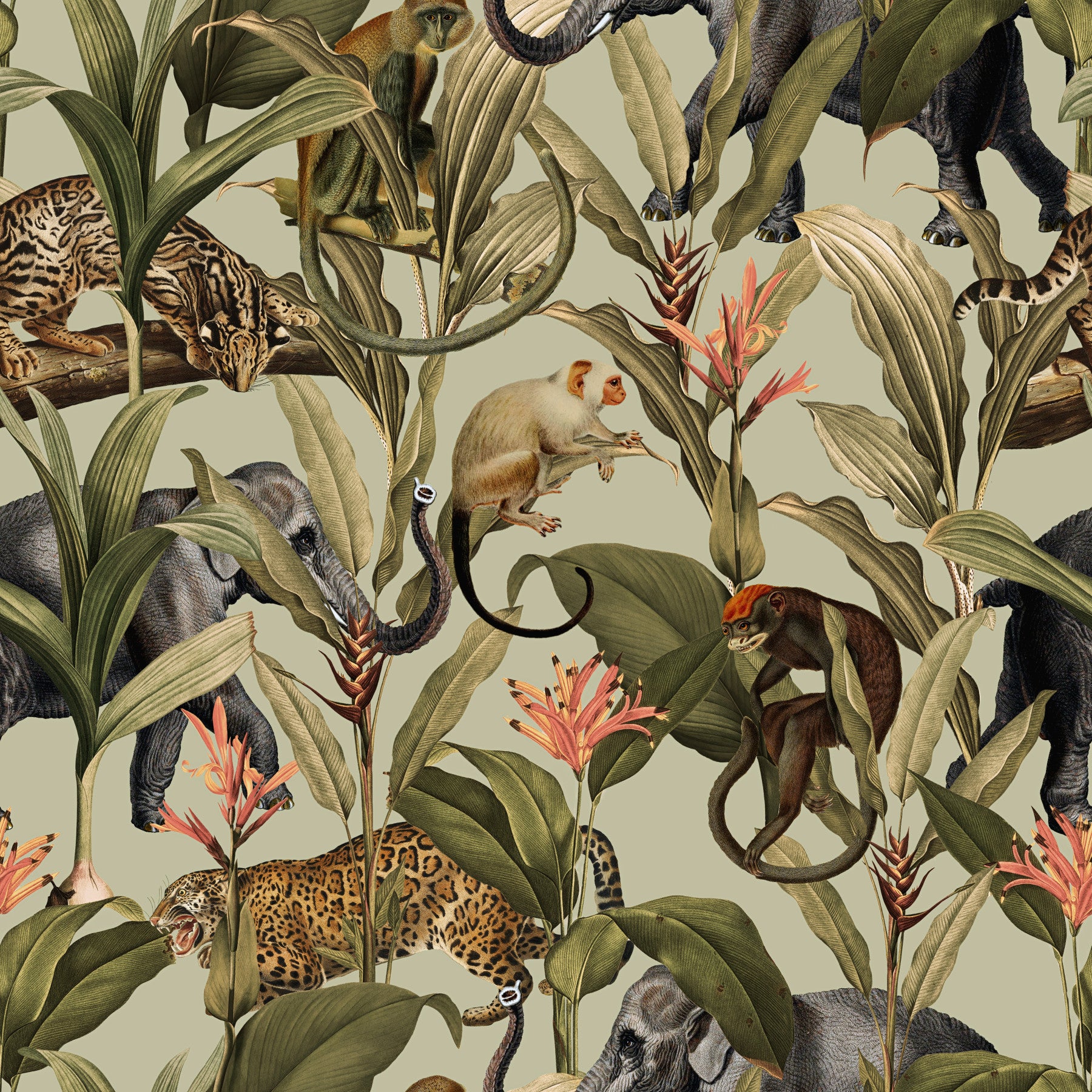 Immerse yourself in the lush beauty of the 'Jungle Majesty' wallpaper. This captivating design showcases a vibrant tapestry of exotic wildlife and tropical foliage. Elephants, jaguars, monkeys, and other creatures are intricately depicted amongst rich green banana leaves and fiery Heliconia flowers. The muted sage green background enhances the vintage aesthetic of the hand-drawn illustrations, creating a sophisticated and elegant feel perfect for adding a touch of the wild to any room. The seamless pattern ensures a cohesive and visually stunning effect, whether used as an accent wall or to cover an entire space. This wallpaper is a celebration of nature's grandeur, offering a sense of tranquility and adventure simultaneously.
