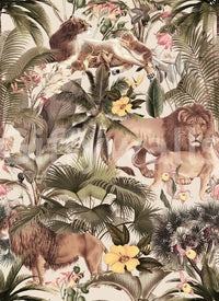Experience the untamed beauty of 'Jungle Majesty,' a captivating wallpaper that captures the raw elegance of lions amidst a lush jungle backdrop. The detailed rendering of the lions, their powerful presence subtly woven into the rich tapestry of tropical flora, creates a striking visual narrative. Muted greens, browns, and warm beige tones give the design a sophisticated vintage aesthetic. Perfect for those seeking a unique and luxurious statement piece for their home, this wallpaper effortlessly transforms any space into a tranquil haven, a testament to the powerful yet harmonious coexistence of nature and its inhabitants. This design is ideal for living rooms, bedrooms, or entryways.
