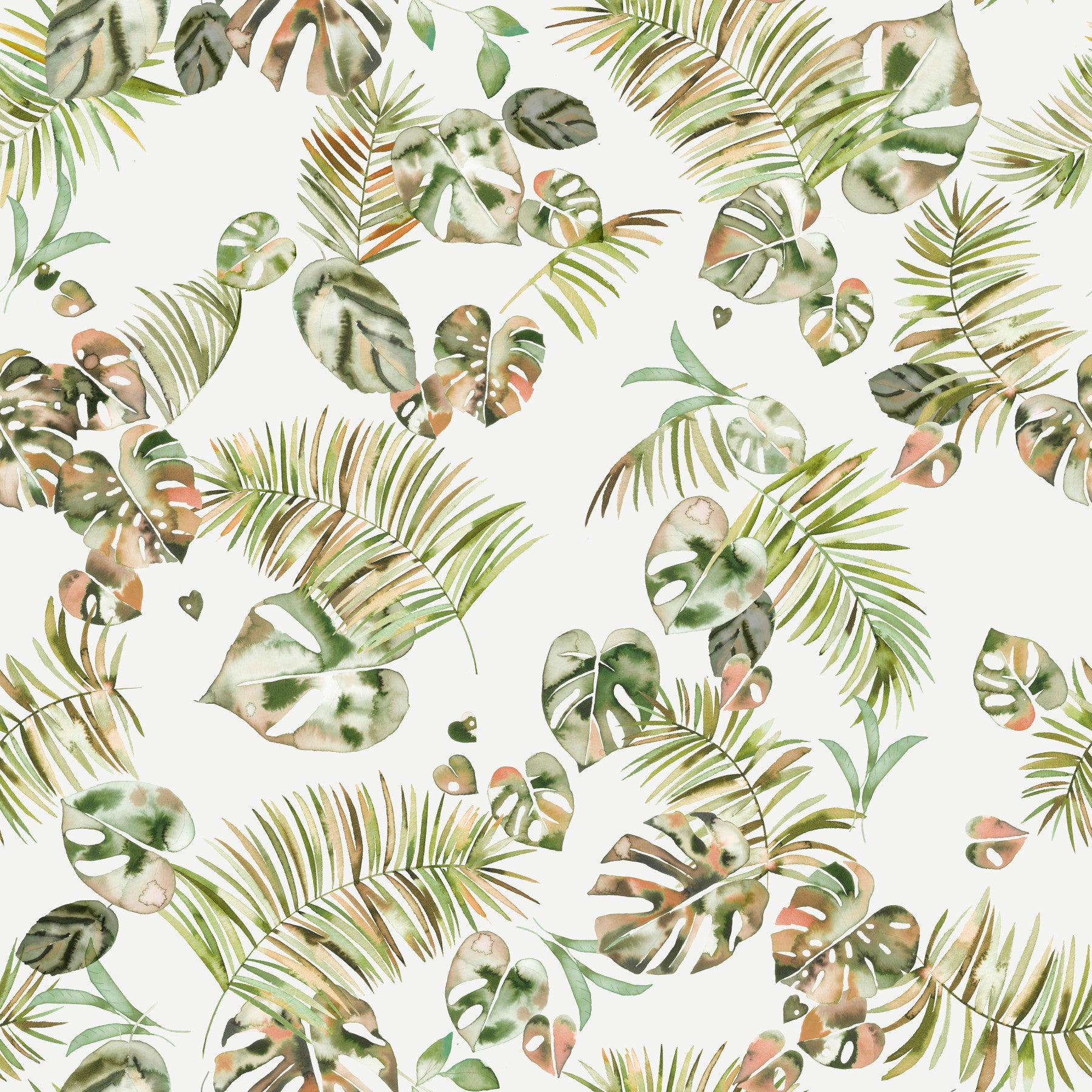 Immerse yourself in the lush beauty of this 'Jungle Tropical Leaves' wallpaper. A captivating watercolor design features a vibrant array of tropical foliage, showcasing the intricate details of monstera leaves and delicate palm fronds. Earthy greens, soft browns, and subtle peach tones create a calming yet invigorating atmosphere, perfect for bringing a touch of exotic paradise to your digital space. The seamless pattern ensures a visually pleasing and consistent aesthetic, transporting you to a tranquil jungle retreat with every glance.