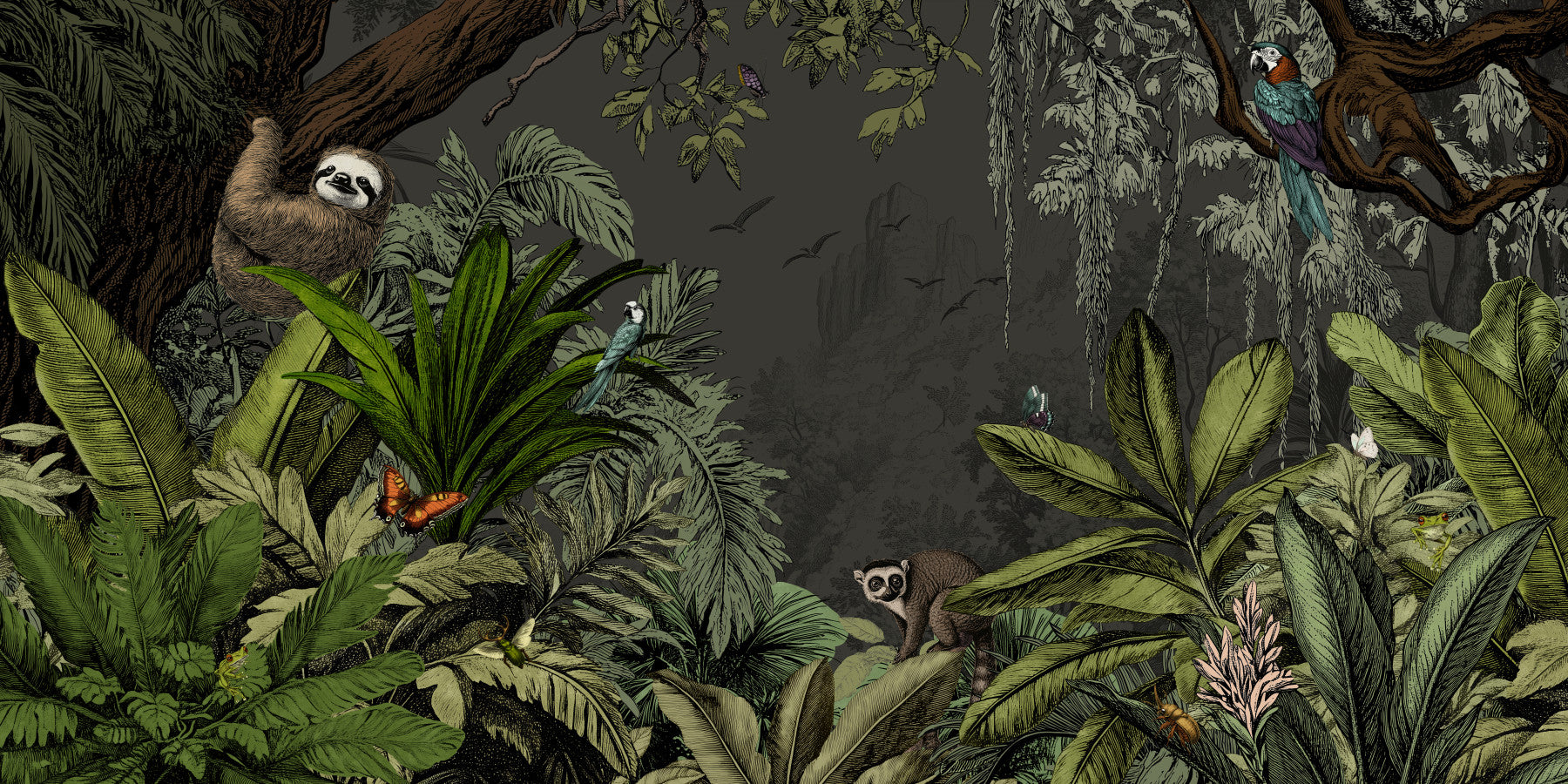 Immerse yourself in the atmosphere of a tropical jungle at night, teeming with wild animals and beautiful butterflies. Drawn in an antique natural history style, this junglecore mural illustration features an adorable sloth, cheeky lemur, colorful macaw parrot and even more creatures hidden in the lush green foliage. Your room will take on a magical, richly historic feeling with this beautiful Jungle Vista mural.
