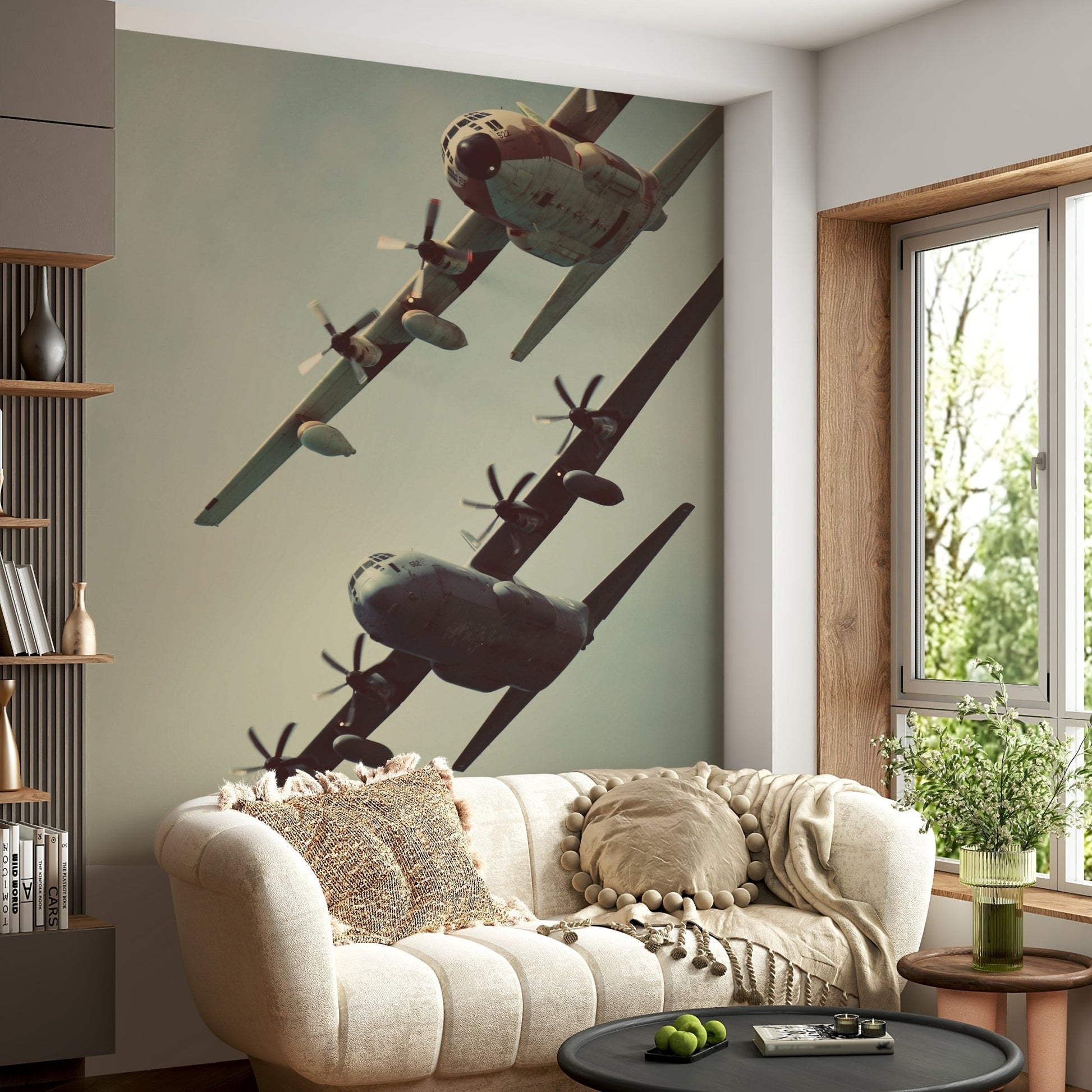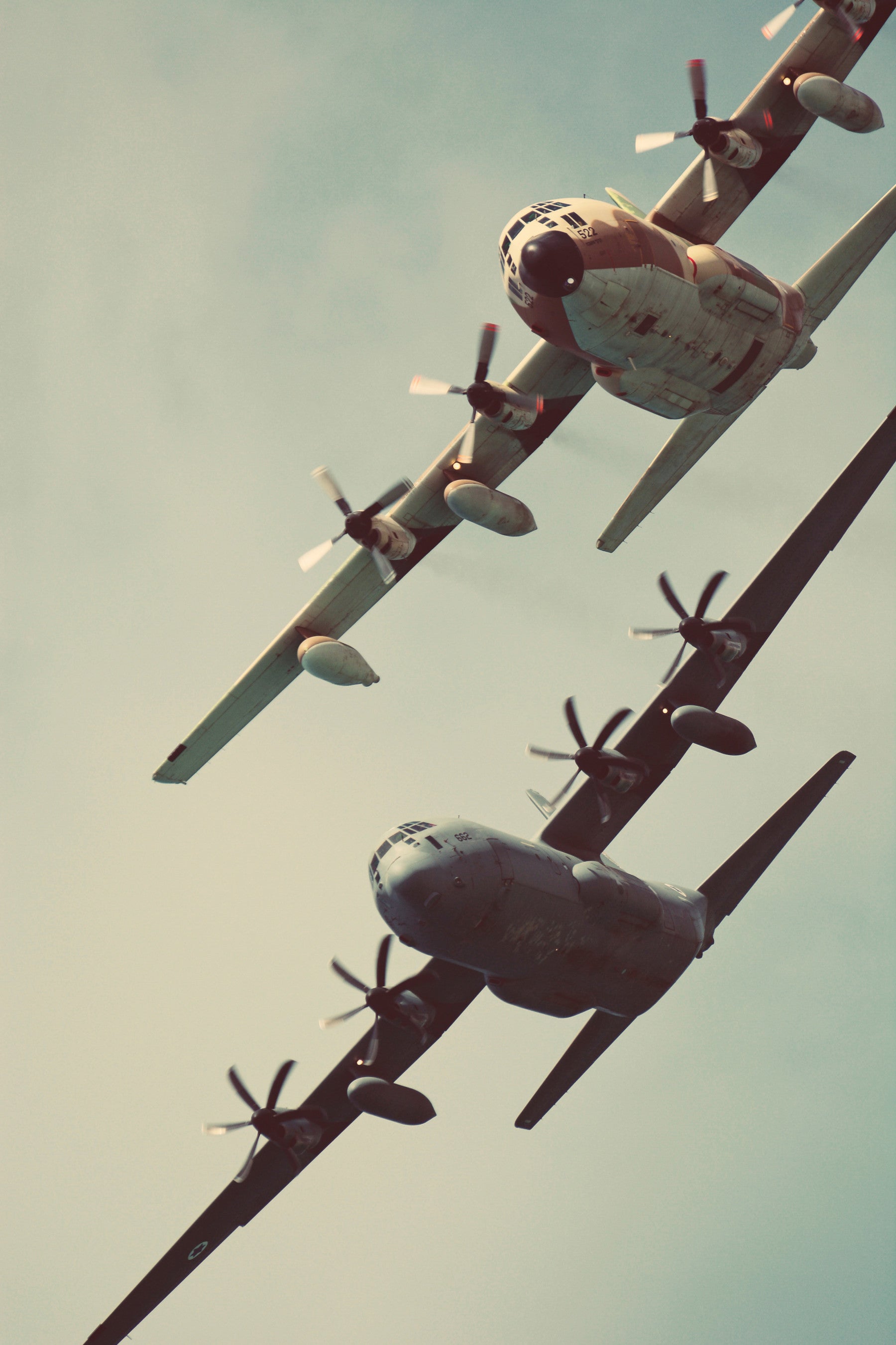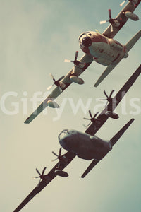 Soar into a world of shared adventure with 'Just the two of us'. This wallpaper captures a breathtaking moment of two magnificent C-130 aircraft flying in close formation against a muted sky. The vintage aesthetic lends a timeless quality to the scene, evoking a sense of nostalgia and companionship. The powerful propellers blurred in motion and the sturdy silhouettes of the planes create a dynamic yet harmonious composition. This image speaks to the idea of teamwork, trust, and the unique bond forged through shared journeys, whether literal or metaphorical. Perfect for those who appreciate the beauty of aviation, or simply seek a reminder of the strength found in partnership.
