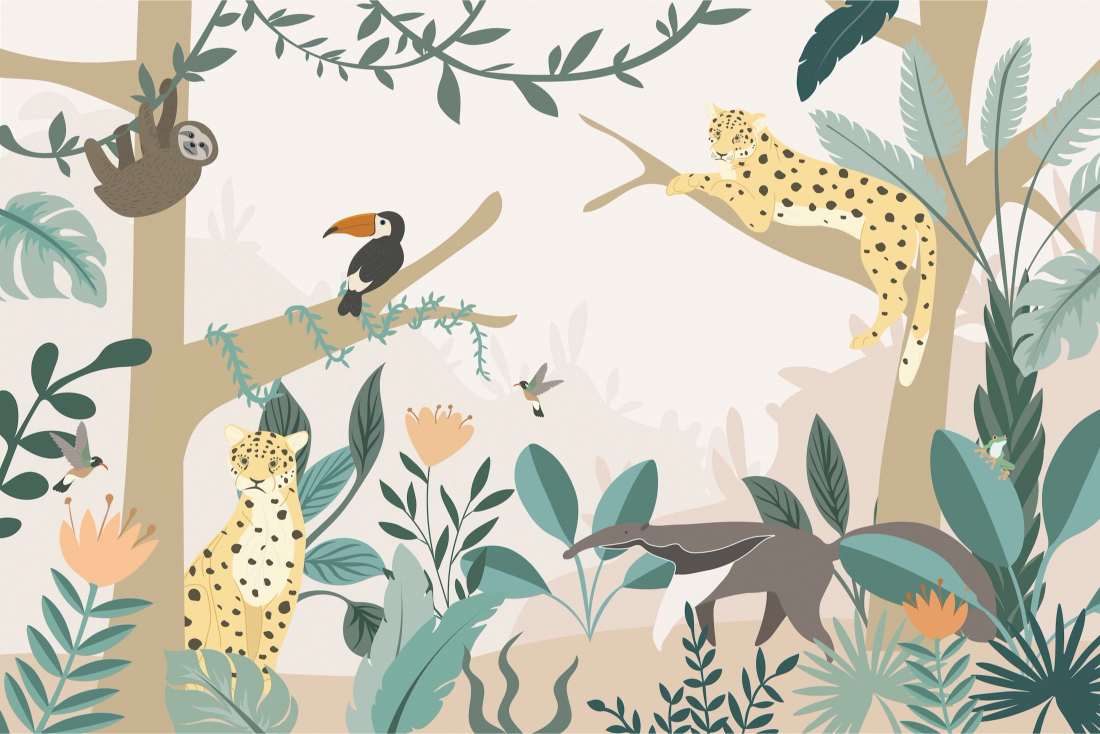 Bring the wild to your child's room with the kid's jungle animal wallpaper mural. The nursery wallpaper is filled with a mix of jungle animals in a beautifully illustrated scene, ideal for sparking creativity and joy. Each glance at the mural offers something new to discover, keeping your little one engaged and entertained. The mural is of a sloth hanging amicably from a tree, a toucan peeking out of a branch, and a leopard lying around playing. It's made of long-lasting, quality material that will stand the test of time, giving your home beauty for years. It is easy to clean, and its colours will remain vivid even in the busiest nursery.