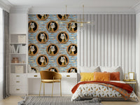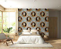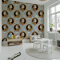 Introduce a hint of quirkiness with this artistic wallpaper by Uta Naumann. Golden-framed cat portraits inspired by the famous Vermeer painting contrast with a bright blue ocean-inspired background. Many different types of fish float about the cat's heads, filling in all of the background. This unique wallpaper for walls is perfect for those who want to add an element of wit to their interiors. Its unique design serves as an excellent conversation starter, bringing sophistication to hallways, bedrooms, or even an office. The blend of the classic and the quirky guarantees an unforgettable interior design.