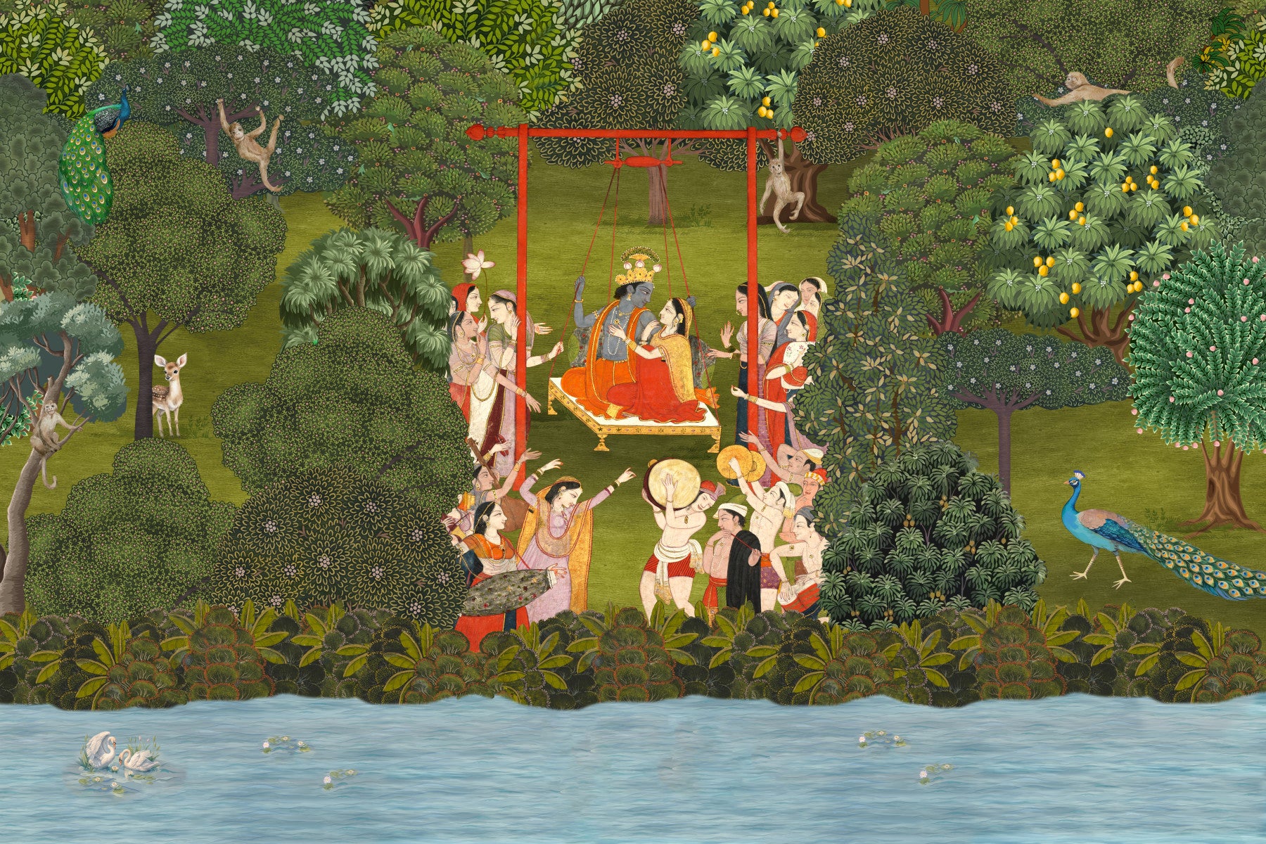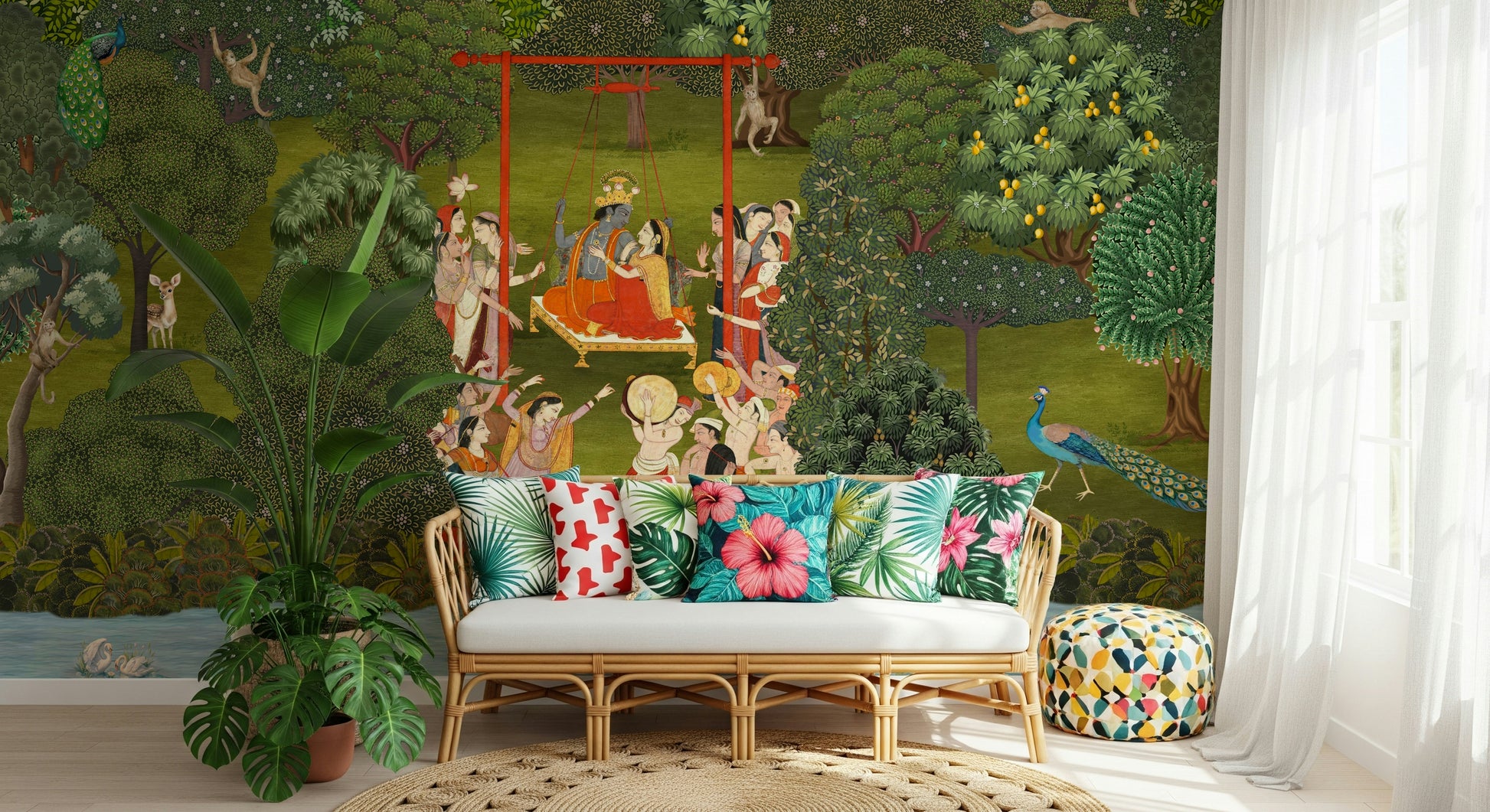 Invite serenity into your home with this enchanting mural. This wallpaper for walls brings an idyllic garden scene to life. A vibrant color palette of rich greens, blues, and reds creates a captivating visual experience. Intricate details and lush foliage transport you to a peaceful oasis. Ideal for living rooms, bedrooms, or meditation spaces, this wall décor enhances the ambiance with a touch of cultural elegance and whimsical charm. Transform your living spaces into a tranquil retreat.