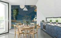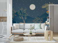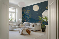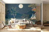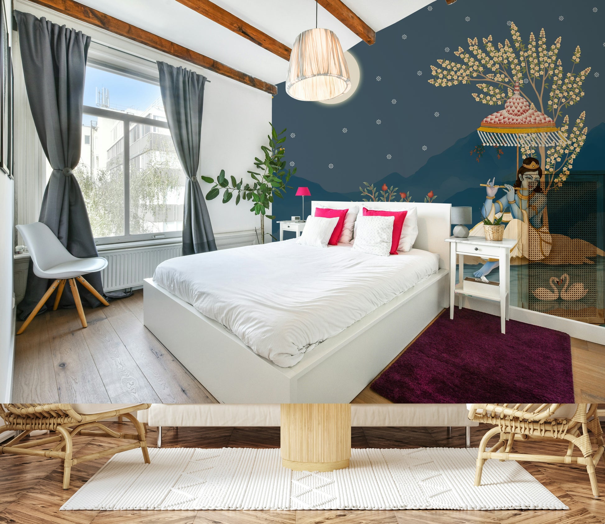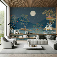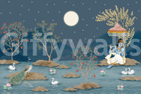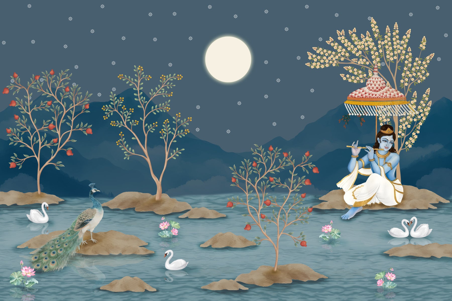 Transform your walls with this tranquil scene. This design features Krishna playing the flute in a serene landscape under a luminous full moon. Swans glide on water amidst flowering trees and a majestic peacock. The color palette of blues, whites, and creams creates a calming atmosphere. Ideal for bedrooms, meditation spaces, or living areas, this wallpaper for walls brings a touch of serenity and artistry to any room. Enhance your home décor with this elegantly spiritual backdrop.