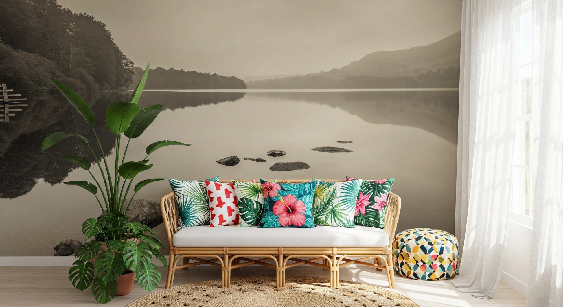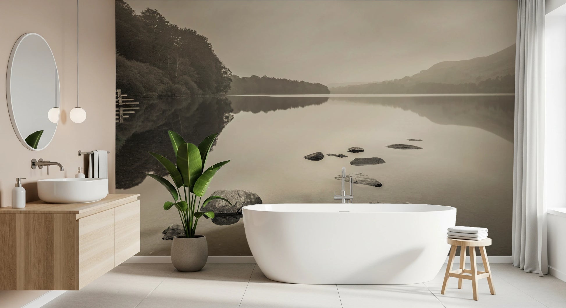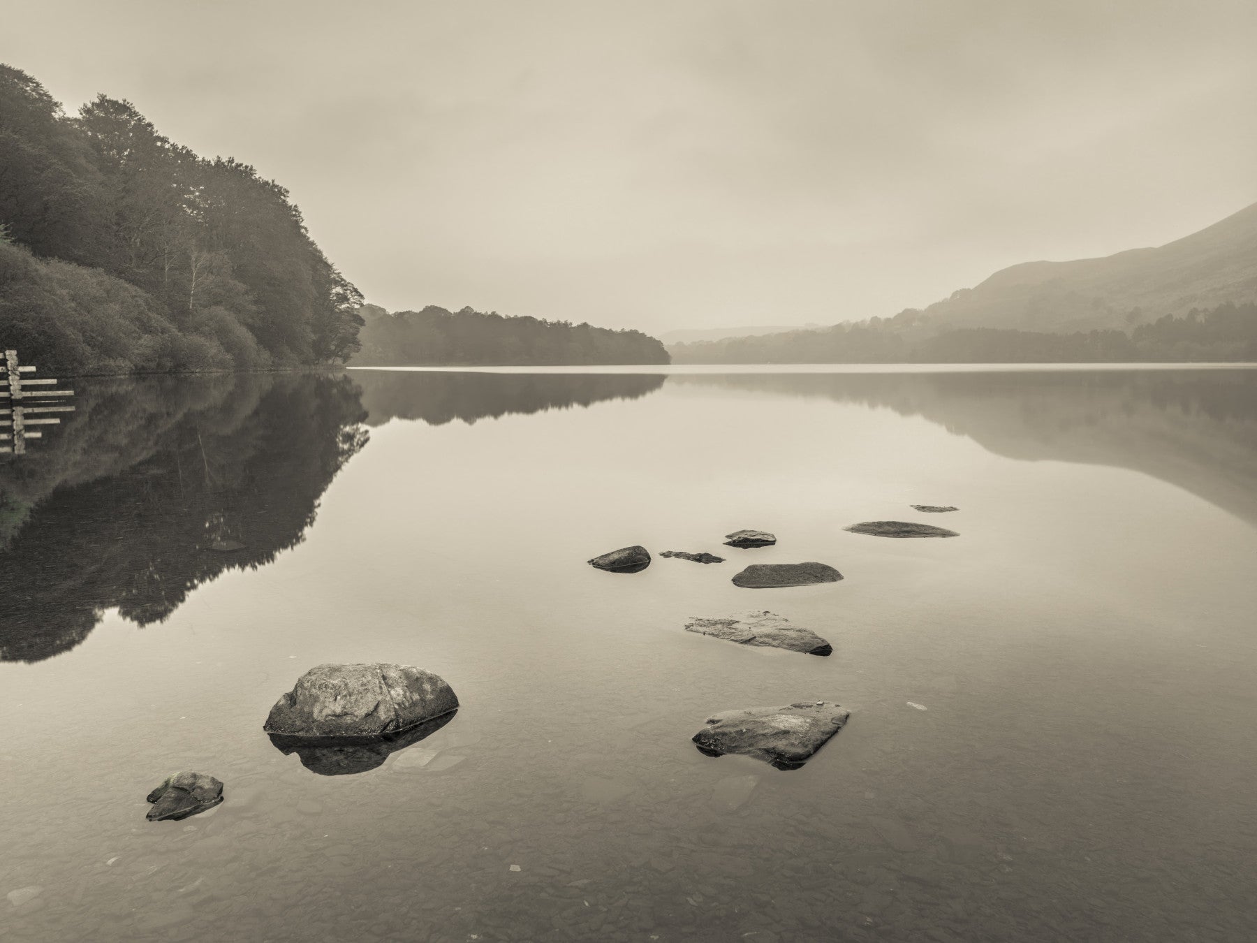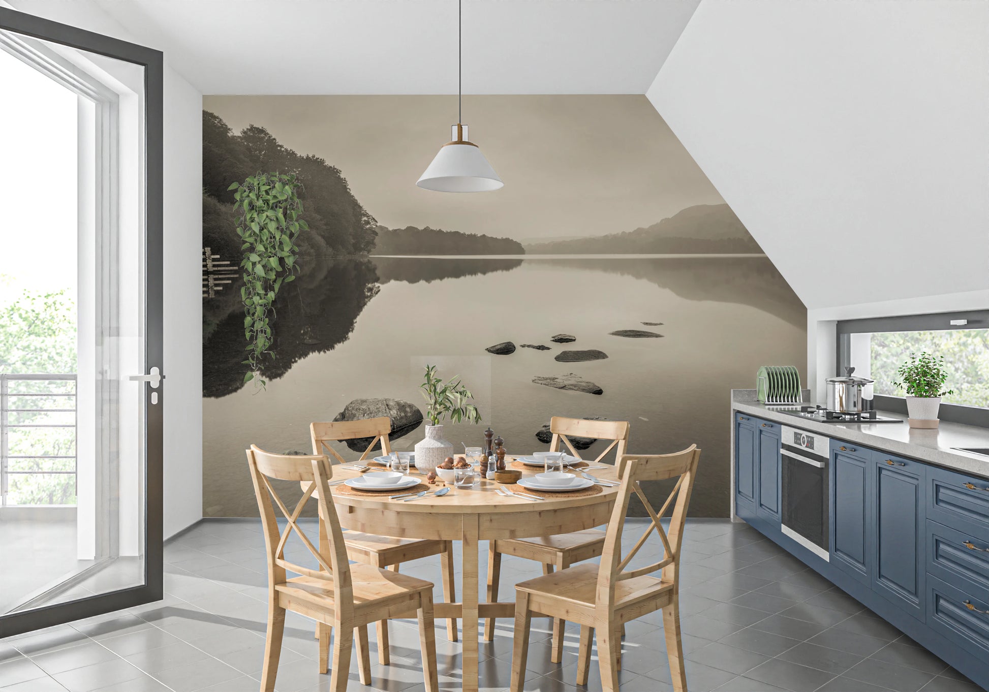 Invite tranquility into your space with 'Lake Calmness.' This serene vista captures the ethereal beauty of a still lake, its surface mirroring the soft, muted tones of the sky and surrounding hills. A line of stones emerges from the water, creating a path into the heart of this peaceful scene. The overall effect is one of profound quietude, a haven from the everyday world. Ideal for creating a calming atmosphere in any room, this wall décor offers a subtle yet powerful statement of serenity. Its neutral palette ensures seamless integration into a variety of interior styles, promising a soothing and refined ambiance.