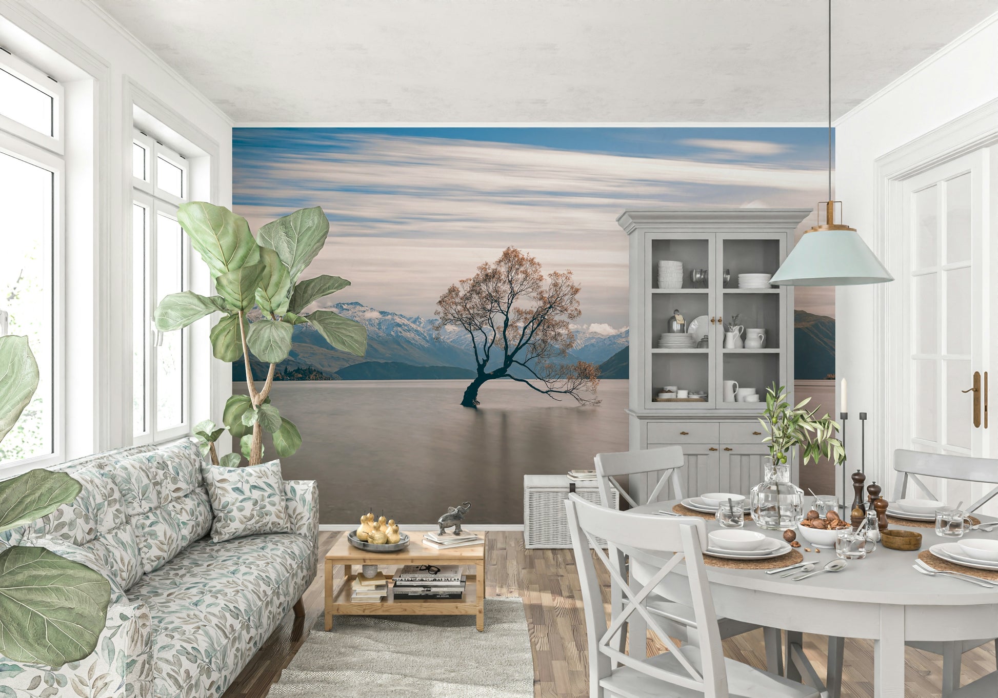 Capture the tranquil beauty of New Zealand with this serene landscape. A lone tree stands gracefully in the calm waters of Lake Wanaka, backed by majestic mountains and a pastel sky. The design brings nature's peace indoors, perfect for creating a soothing atmosphere. Install this wallpaper for walls in bedrooms, living areas, or offices for a touch of the great outdoors. The subtle color palette complements modern and minimalist interiors, adding depth and visual interest to any space. Evoke a sense of calm and wanderlust with this picturesque scene.