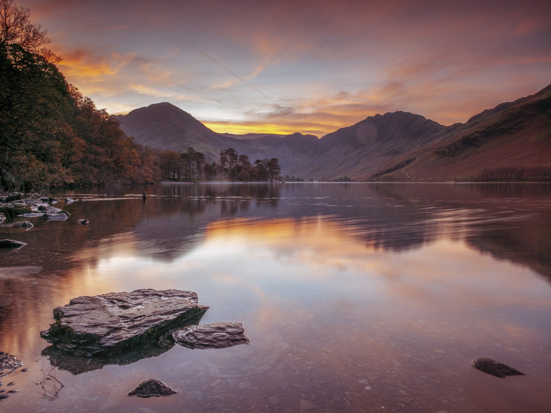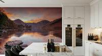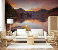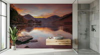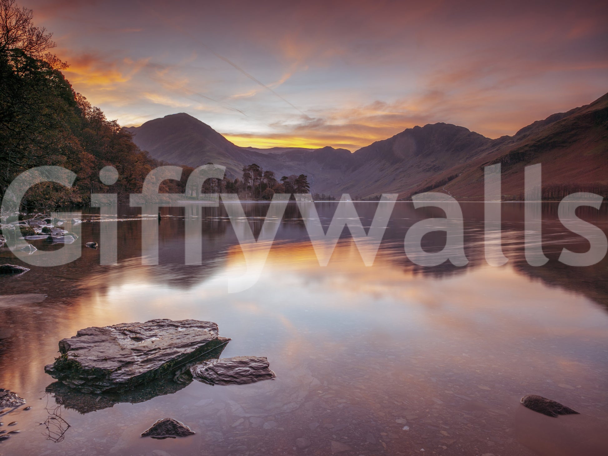 Transform your space with "Lakeland Sunrise," a breathtaking vista capturing the serene beauty of dawn breaking over tranquil waters. Majestic peaks stand guard on the horizon, their silhouettes softened by the pastel hues of the awakening sky. The water mirrors the spectacle above, creating a seamless blend of earth and sky awash in the warm glow of the rising sun. Patches of autumnal trees in the foreground add depth and texture, their fiery foliage a striking contrast to the cool, reflective lake. Delicate ripples disturb the perfect reflection, infusing the scene with a gentle sense of movement and life. Let this captivating image transport you to a place of peace and tranquility, where the beauty of nature unfolds in all its glory.