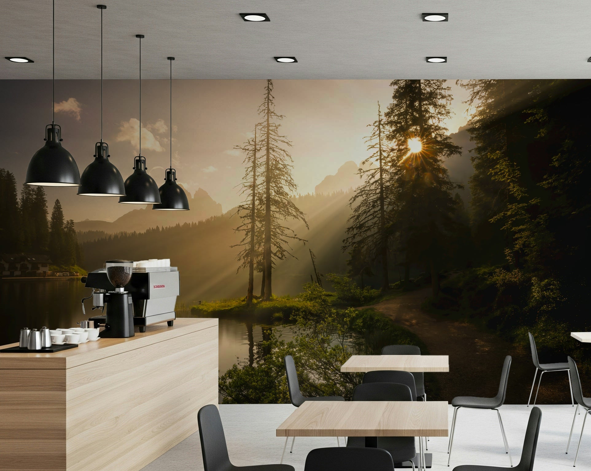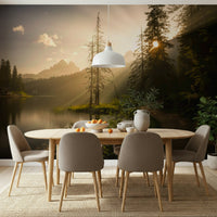 Transform your room with the ethereal beauty of a sunlit lakeside scene. This wallpaper features a peaceful lake reflecting the warmth of a golden sunrise, accentuated by towering trees and mountain views. Soft, diffused light and muted natural colors bring serenity to any interior. This wallpaper for walls captures the quiet beauty of nature. This design improves interiors with calm tones, ideal for a bedroom, bathroom, or home office where you can escape and relax. Make the outdoors part of your everyday life.