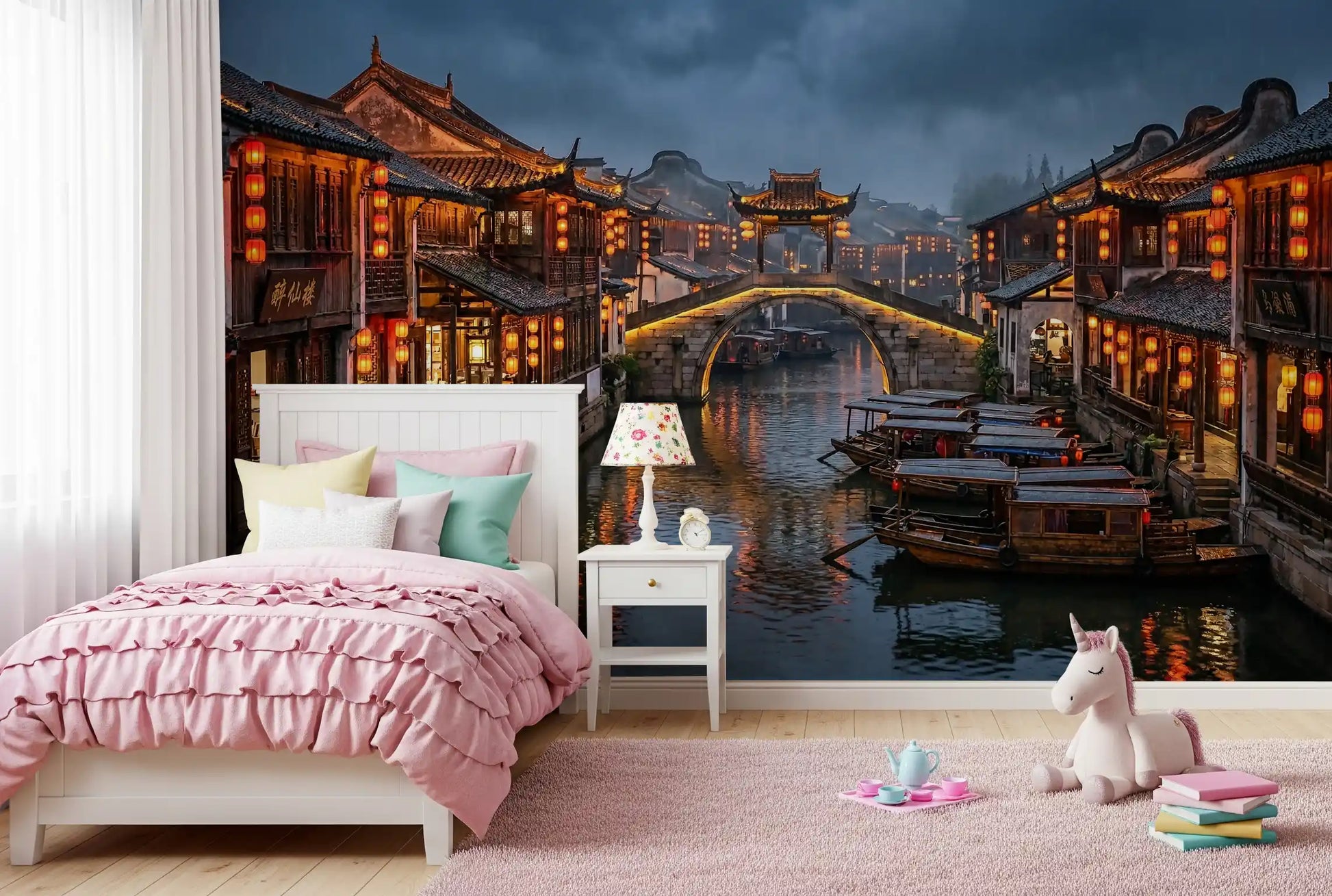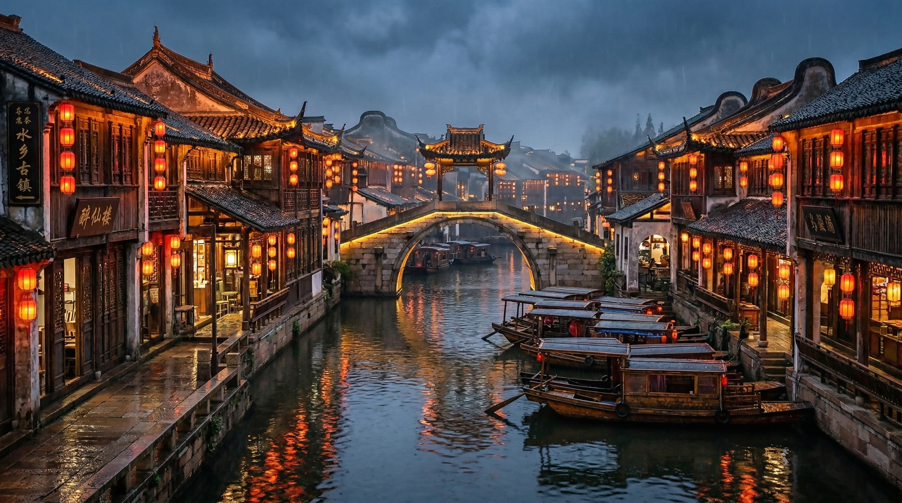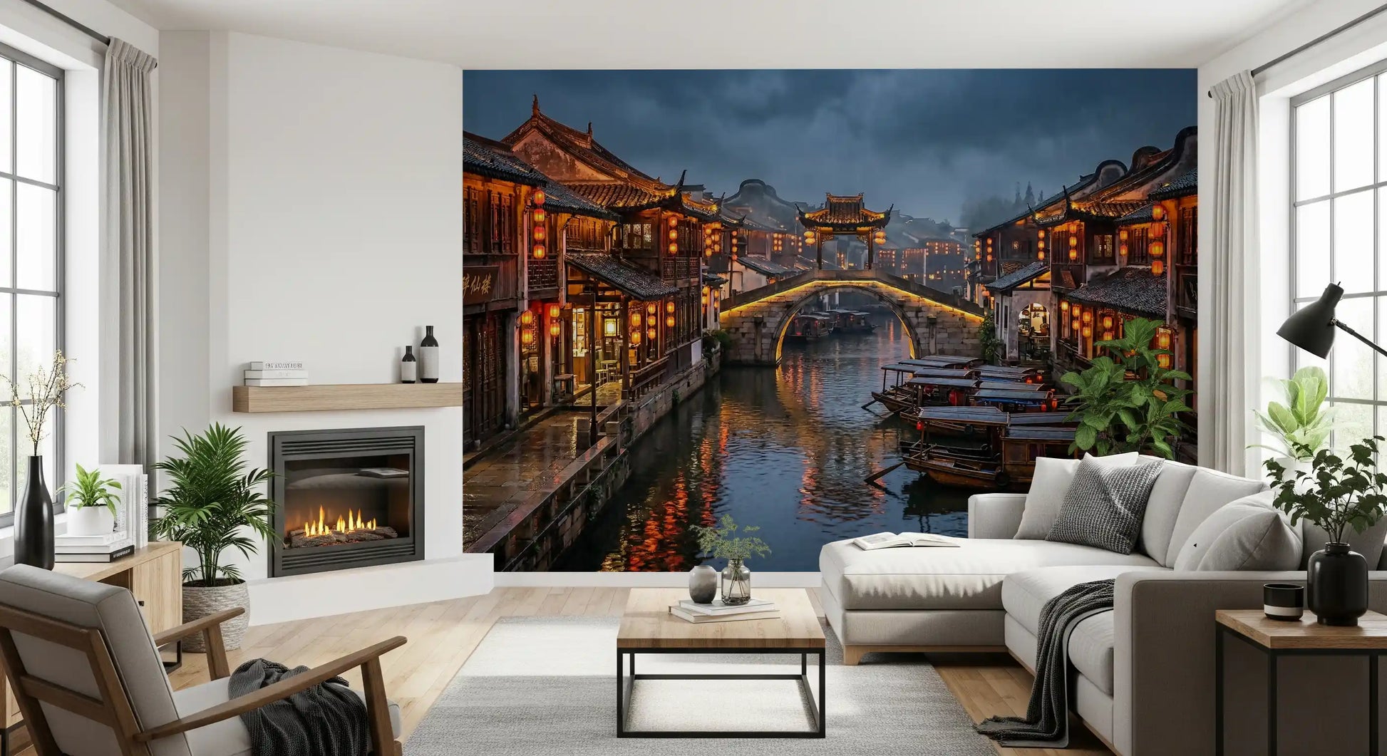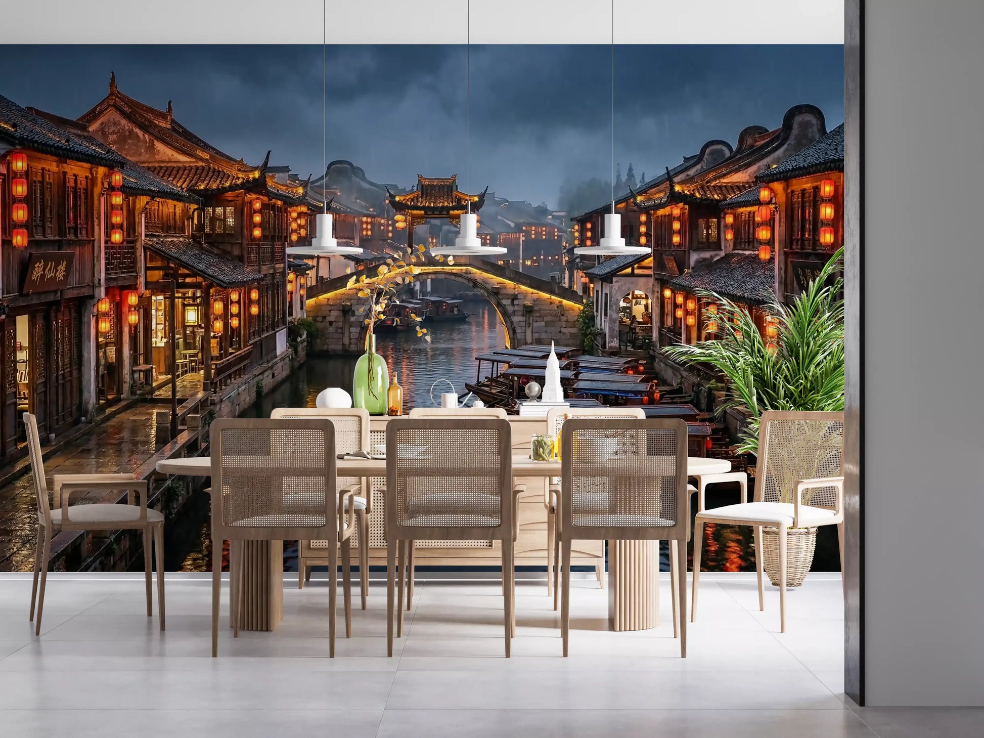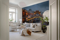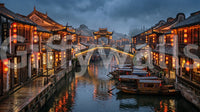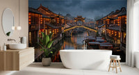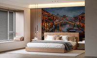 Immerse your space in the tranquil beauty of an ancient East Asian water town. This captivating wallpaper for walls captures a picturesque canal scene under a moody, overcast sky, illuminated by warm orange lanterns. Traditional wooden buildings line the waterway, their intricate details reflecting gracefully on the calm water where classic boats softly drift. The rich color palette, featuring deep blues and grays contrasted with vibrant reds and golden yellows, creates an inviting and dramatic ambiance. This design brings a sense of serene cultural history and quiet elegance to living rooms, dining areas, or studies. It transforms any wall into a captivating window to a timeless, atmospheric destination, adding depth and a unique focal point to your interior design.
