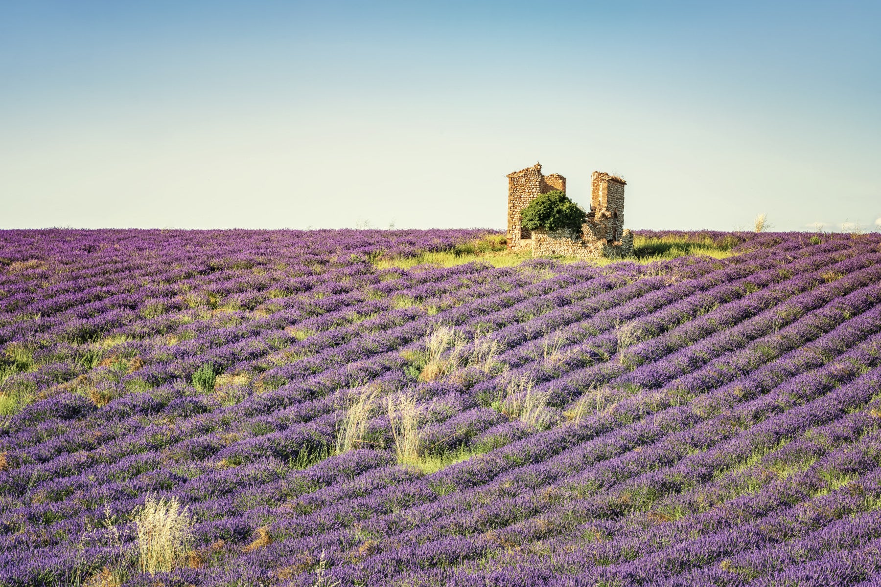 This stunning wallpaper for walls captures the romantic beauty of a lavender field under a serene sky. The landscape includes soft purple flowers. An old stone ruin adds a touch of history and rustic allure. This design enhances bedrooms, living rooms, or any space wanting a soothing touch. Let this wallpaper transform your interior into a tranquil oasis, inviting you to relax and unwind. The lavender hue adds a touch of understated charm, making it a perfect choice for various interior styles from French Country to minimalist.