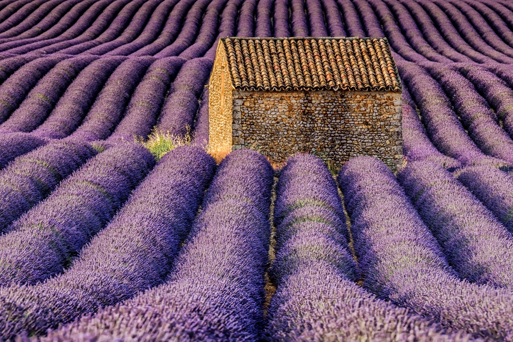 Escape to the serene beauty of 'Lavender Haven'. This captivating wallpaper transports you to the heart of Provence, where endless rows of fragrant lavender fields meet the rustic charm of a solitary stone cottage. Bathed in the warm, golden light of the setting sun, the image evokes a sense of tranquility and peace. The repeating patterns of lavender blooms create a soothing visual rhythm, while the weathered stones and terracotta roof of the structure offer a touch of timeless elegance. 'Lavender Haven' is more than just a wallpaper; it's an invitation to slow down, breathe deeply, and immerse yourself in the simple joys of nature. Perfect for creating a calming and inviting atmosphere in any space.
