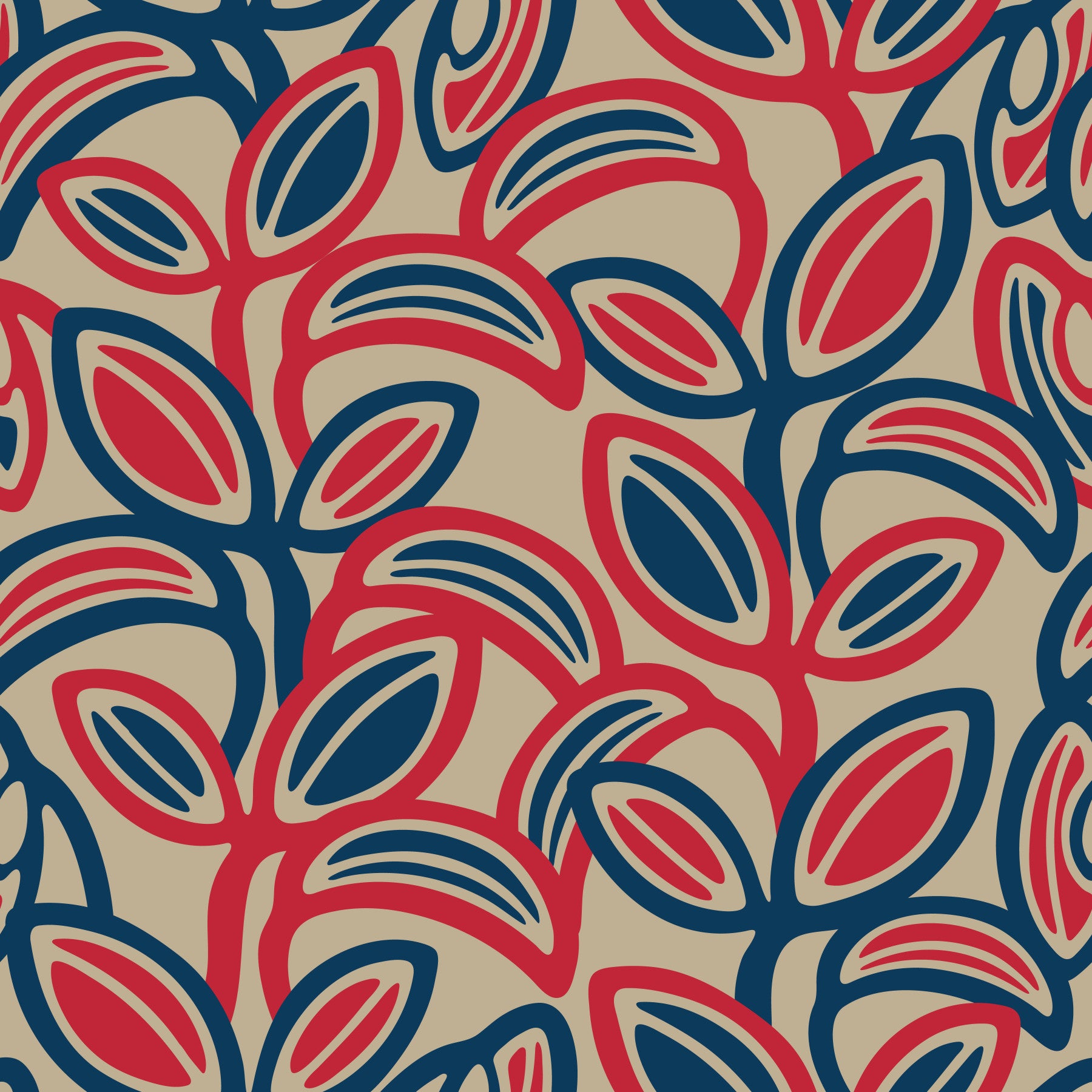 Surround yourself with the Mid Century Modern retro groovy style of this "Leaf Laugh Love" botanical wallpaper that radiates positive energy. This design features an organic pattern of stylized leaves in a vibrant vintage color palette showcasing bright red and navy blue on warm sand beige. The groovy free-flowing shapes evoke a sense of Summer carefree joy, reminiscent of the optimistic spirit of the 1970s. Let this wallpaper inspire laughter, love and good vibes in your space with its playful yet sophisticated design and pop of bright graphic color. This pattern design is also available in Other Colourways too! Original wallpaper pattern design by Jackie Tahara of UnBlink Studio.
