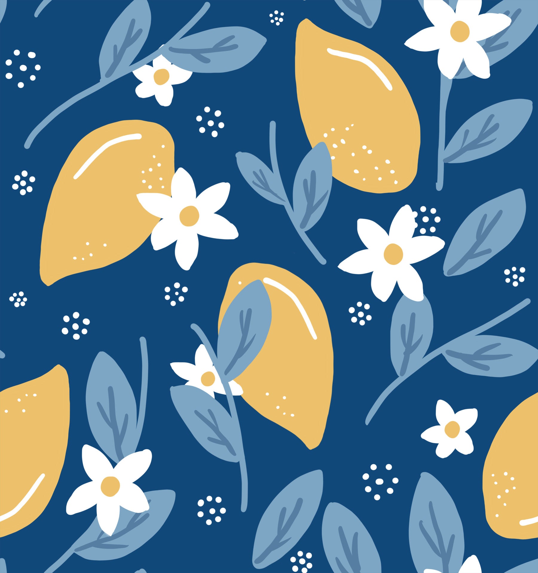 Golden citrus fruits and delicate white blossoms create a rhythmic dance across a deep navy background in this Mediterranean-inspired motif. This custom-size wallpaper features hand-drawn illustrations of ripe lemons nestled among soft blue leaves and whimsical white speckles that add a touch of charm. The high-contrast color palette provides a bold visual impact while maintaining a classic, timeless feel that suits various interior aesthetics. Each element is carefully illustrated to ensure a cohesive repeat that flows naturally across any surface. By blending organic shapes with a sophisticated dark base, the pattern offers a refreshing take on traditional botanical themes. This durable wall covering ensures a professional finish that remains vibrant and sharp, providing a high-quality look for your specialized project.