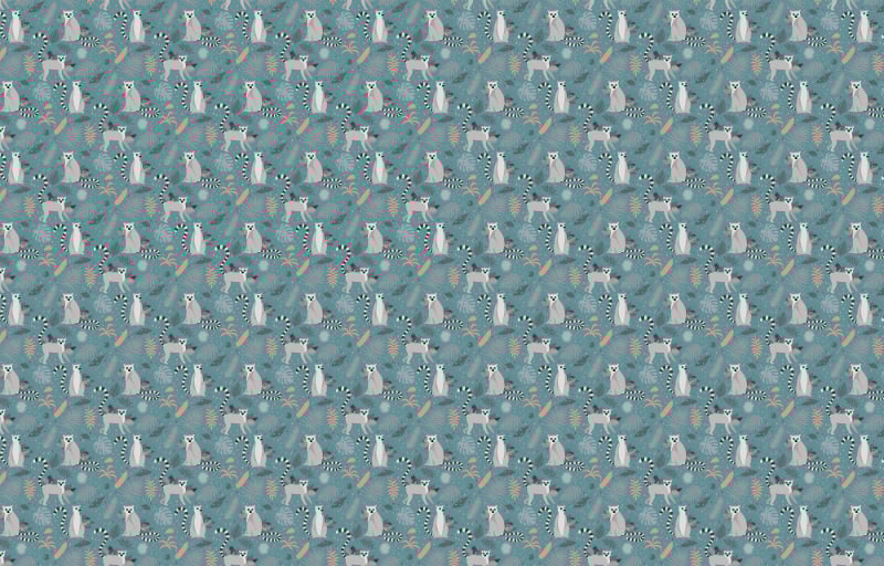 Such a light and fun design would serve well in a cheerful space. The repetitive motif depicts lemurs playing across a vibrant mass of tropical palm fronds, giving an impression of a thriving natural enclosure. The soft teal wall acts as a soothing wall and allows the grey and white of the lemurs to stand out while the intense green of the leaves stands out. Thereby,  pattern wallpaper design can also lend a playful and lighthearted atmosphere to the room, ideal for those wanting to bring a touch of nature's joy to their surroundings without being too sensory-stimulating.