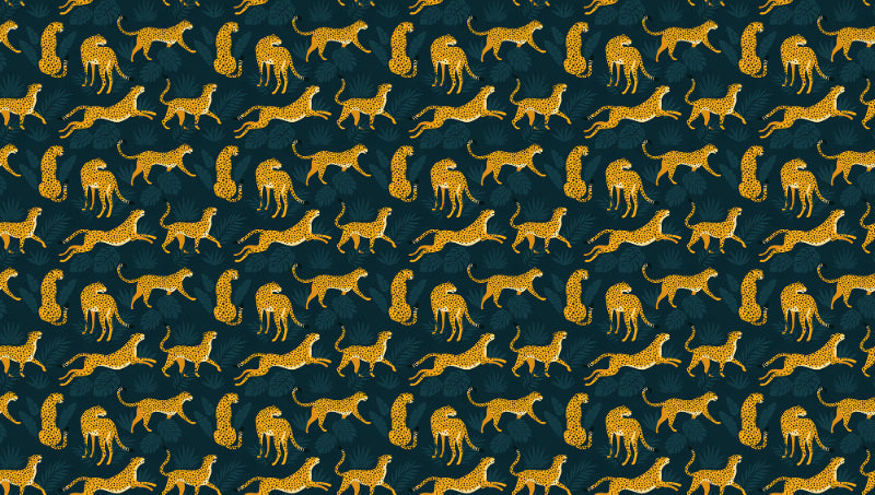 The wallpaper you've chosen features a dynamic repeat pattern with leopards in a lively shade of yellow that pops against the deep blue backdrop. This design brings a sense of the wild into any space, imbuing it with life force and motion, yet not overemphasizing the senses. The whimsical composition of leopards in different shapes provides an effect of movement and activity. This yellow wallpaper is an ideal solution for those who want to add a touch of drama to their interior design without necessarily overwhelming them with a strong graphic pattern while maintaining simplicity and a balanced design. It's an excellent option for livening a room with animal charm.