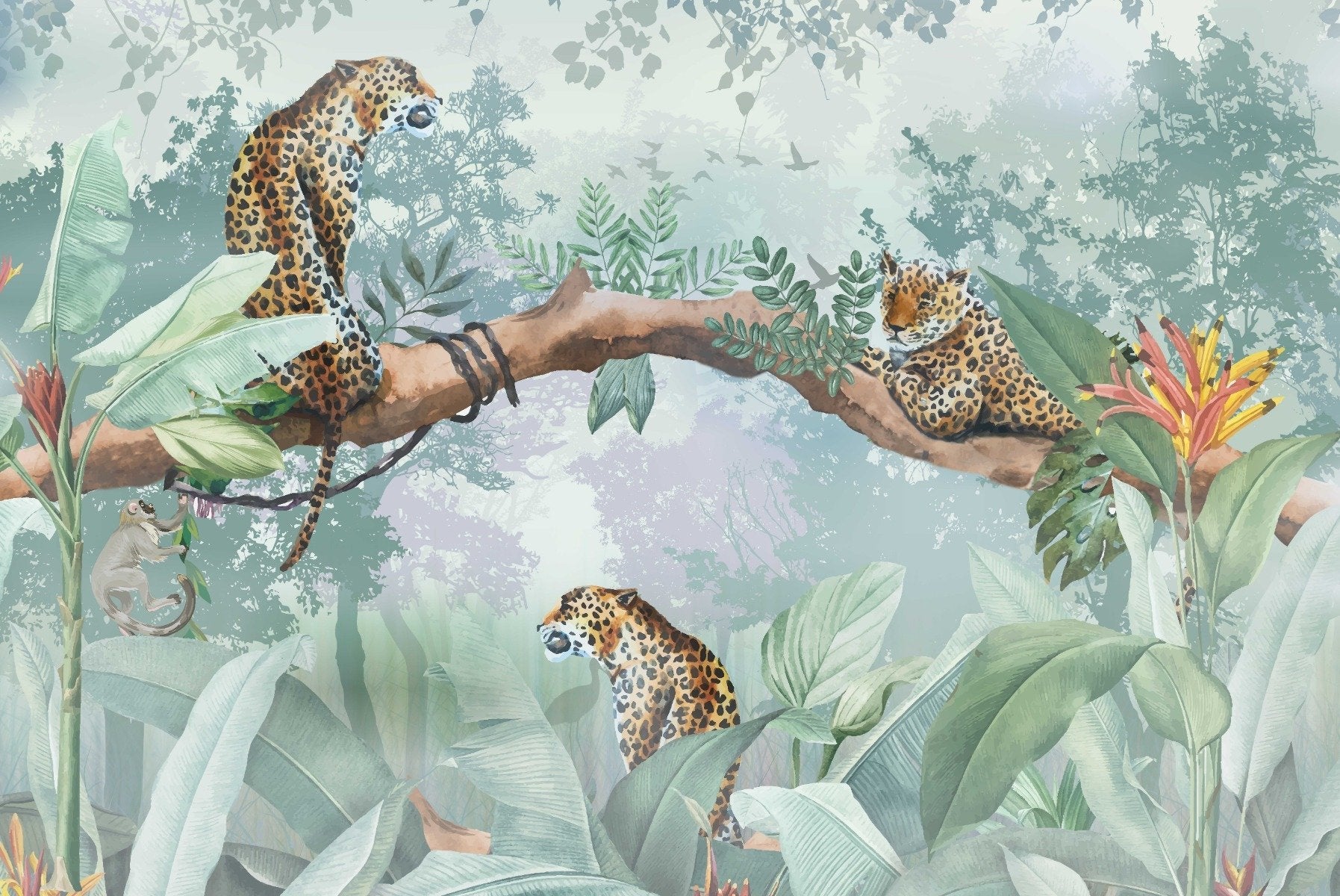 The leopard on the trees wallpaper mural brings a touch of wild beauty into your space. Captivating, with its majestic leopard standing gracefully within the towering trees and a lush forest backdrop, the stunning details of the leopard's coat combined with the elements create an air of adventure and elegance for bringing that beauty from the wild into your house. Perfect for a living room, bedroom, or office, this mural makes for a strong, nature-inspired statement that easily pairs wildlife with sophistication for a unique focal point.